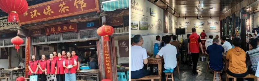 “环保茶馆”和环保店小二(左)、赵化镇“环保茶馆”开展环保政策宣讲活动(右)