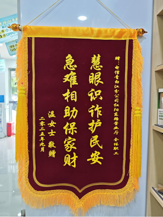 事后,温女士专程向营业厅赠送锦旗,表达自己的感激之情。青白江区反诈中心对中国电信青白江分公司给予高度评价,称赞反诈意识强、反诈工作执行到位,对营业员的细心观察和果断处置表示衷心感谢,并将该案例作为典型进行广泛推广。