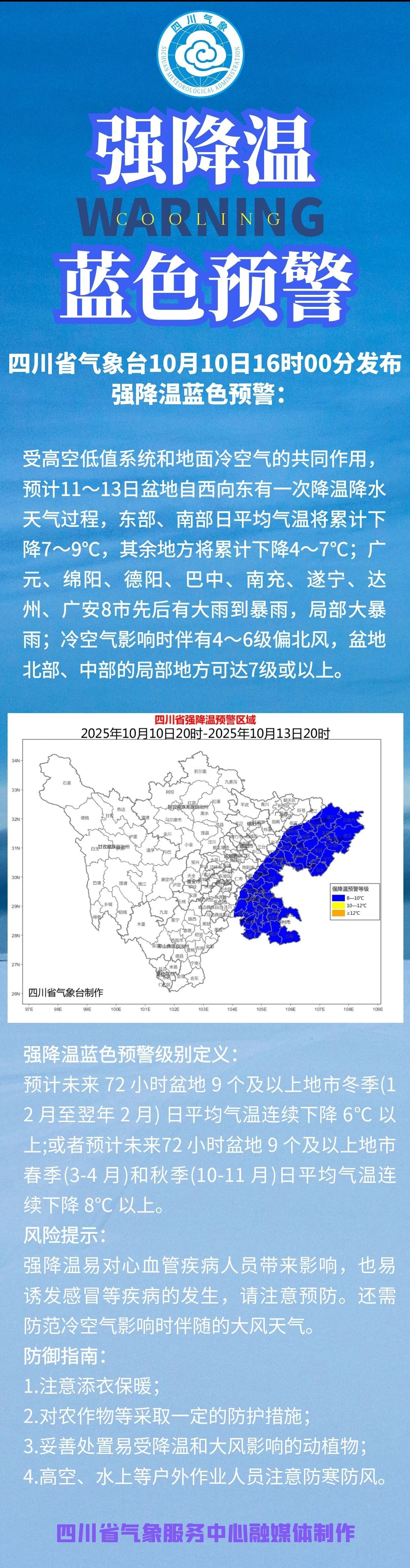 四川发布客户端消息 四川省气象台10月10日16时00分发布强降温蓝色预警:受高空低值系统和地面冷空气的共同作用,预计11~13日盆地自西向东有一次降温降水天气过程,东部、南部日平均气温将累计下降7~9℃,其余地方将累计下降4~7℃;广元、绵阳、德阳、巴中、南充、遂宁、达州、广安8市先后有大雨到暴雨,局部大暴雨;冷空气影响时伴有4~6级偏北风,盆地北部、中部的局部地方可达7级或以上。