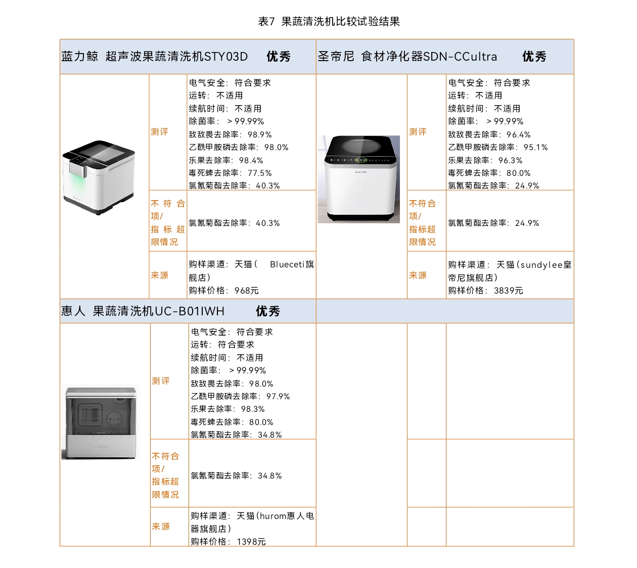 测评结果显示,惠人果蔬清洗机UC-B01IWH蓝力鲸、超声波果蔬清洗机STY03D、圣帝尼 食材净化器SDN-CCultra为优秀。