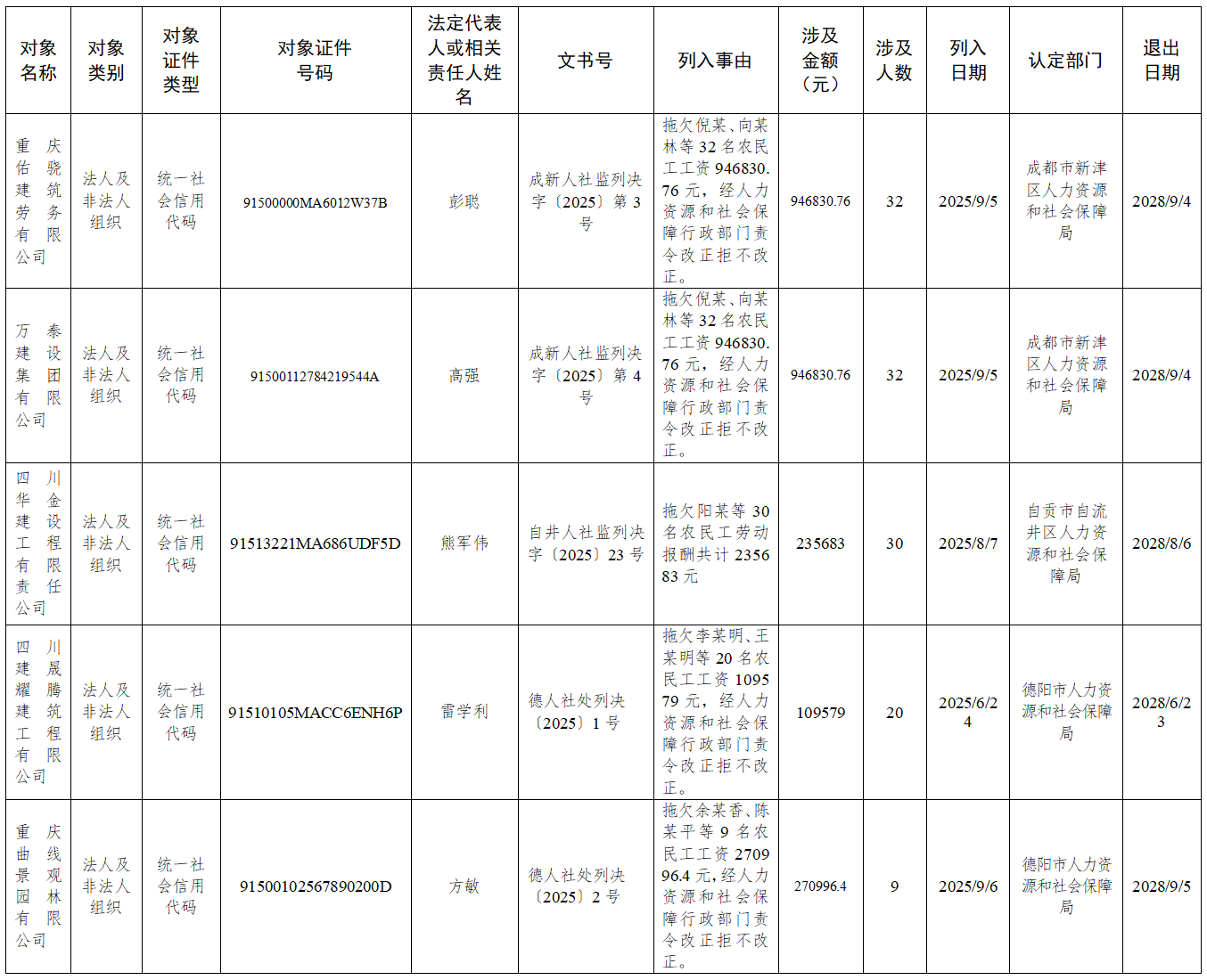 四川发布客户端消息 为加大对重大劳动保障违法行为的惩戒力度,强化对用人单位守法诚信的社会监督,10月11日,四川省人力资源和社会保障厅公布2025年第三季度重大劳动保障违法行为及拖欠农民工工资失信联合惩戒对象名单。