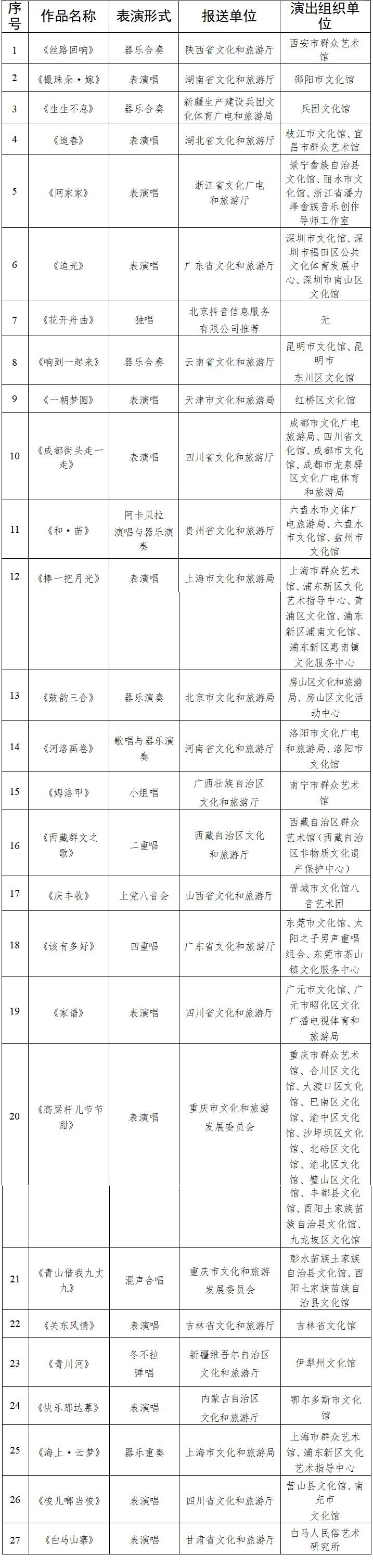 参与终评的27个音乐作品题材广泛,形式多样,既有器乐,又有声乐,涵盖了器乐合奏、表演唱、独唱、阿卡贝拉、重唱、弹唱、混声合唱等多种音乐表演形式。这些作品具有浓郁的地域特色,生动反映了群众文艺工作者扎根生活的创作理念,真挚抒发了人民群众对美好生活的热切向往。