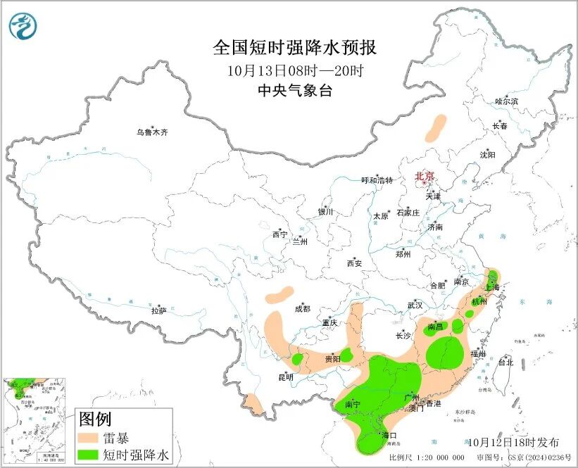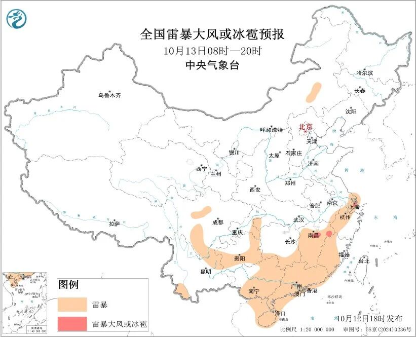 今天,湖南南部、江西中南部、浙江西部、福建西部和北部、广西中东部、广东西部和中部、海南岛西部及重庆东部等地部分地区有分散性大雨,局地暴雨;上述部分地区伴有短时强降水,局地有雷暴大风等强对流天气。