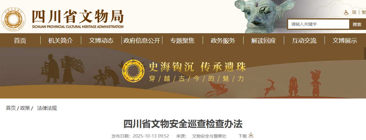 四川发布客户端消息 为进一步加强四川省文物安全巡查检查工作,省文物局修订出台《四川省文物安全巡查检查办法》(以下简称《办法》),自2025年11月13日起施行,有效期5年。