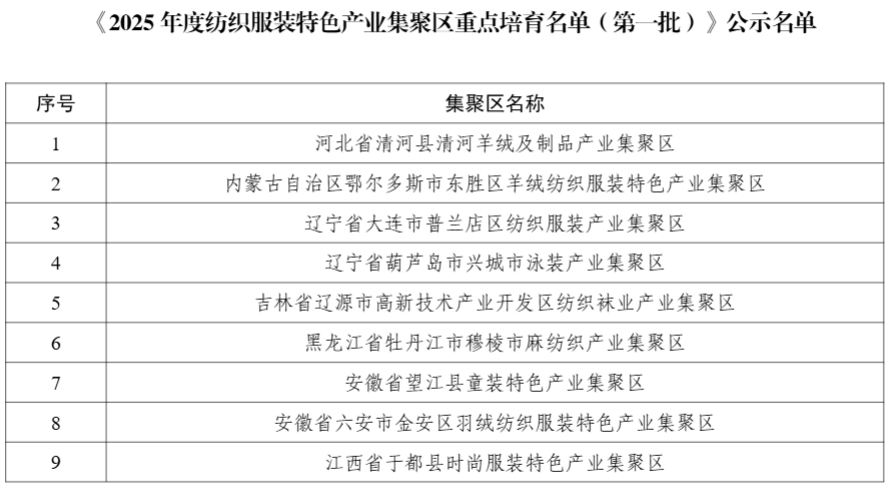 四川发布客户端消息 日前,工业和信息化部消费品工业司公示《2025年度纺织服装特色产业集聚区重点培育名单(第一批)》,公示时间为2025年10月13日至10月17日。