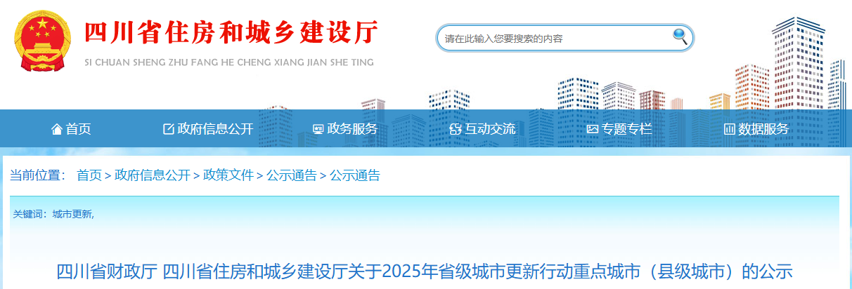 四川发布客户端消息 日前,四川省财政厅、四川省住房和城乡建设厅发布公示,拟确定剑阁县、安岳县、三台县、古蔺县、大英县、仁寿县、营山县、石渠县、邛崃市为2025年省级城市更新行动重点城市(县级城市),公示期为2025年10月16日至10月22日。