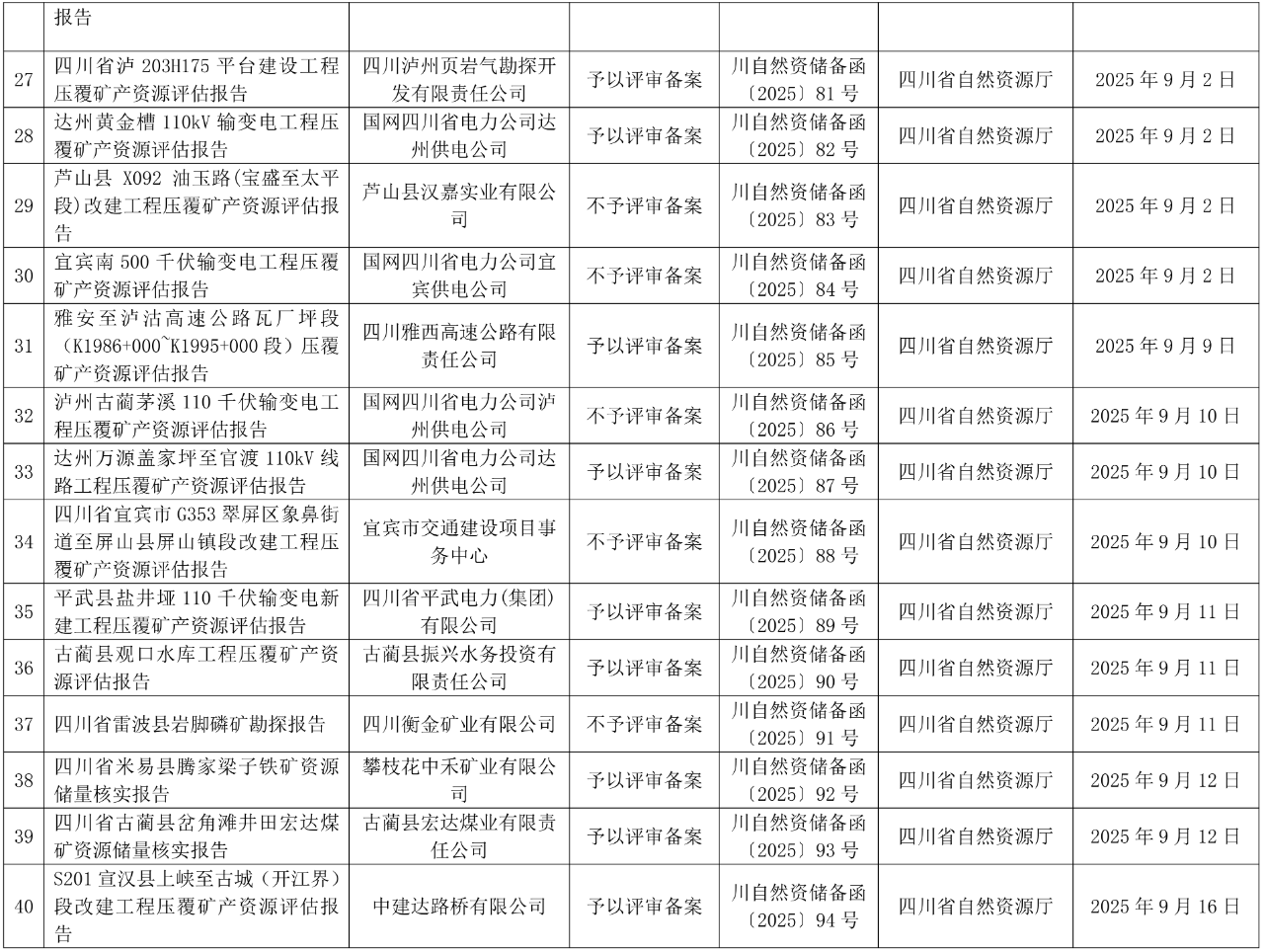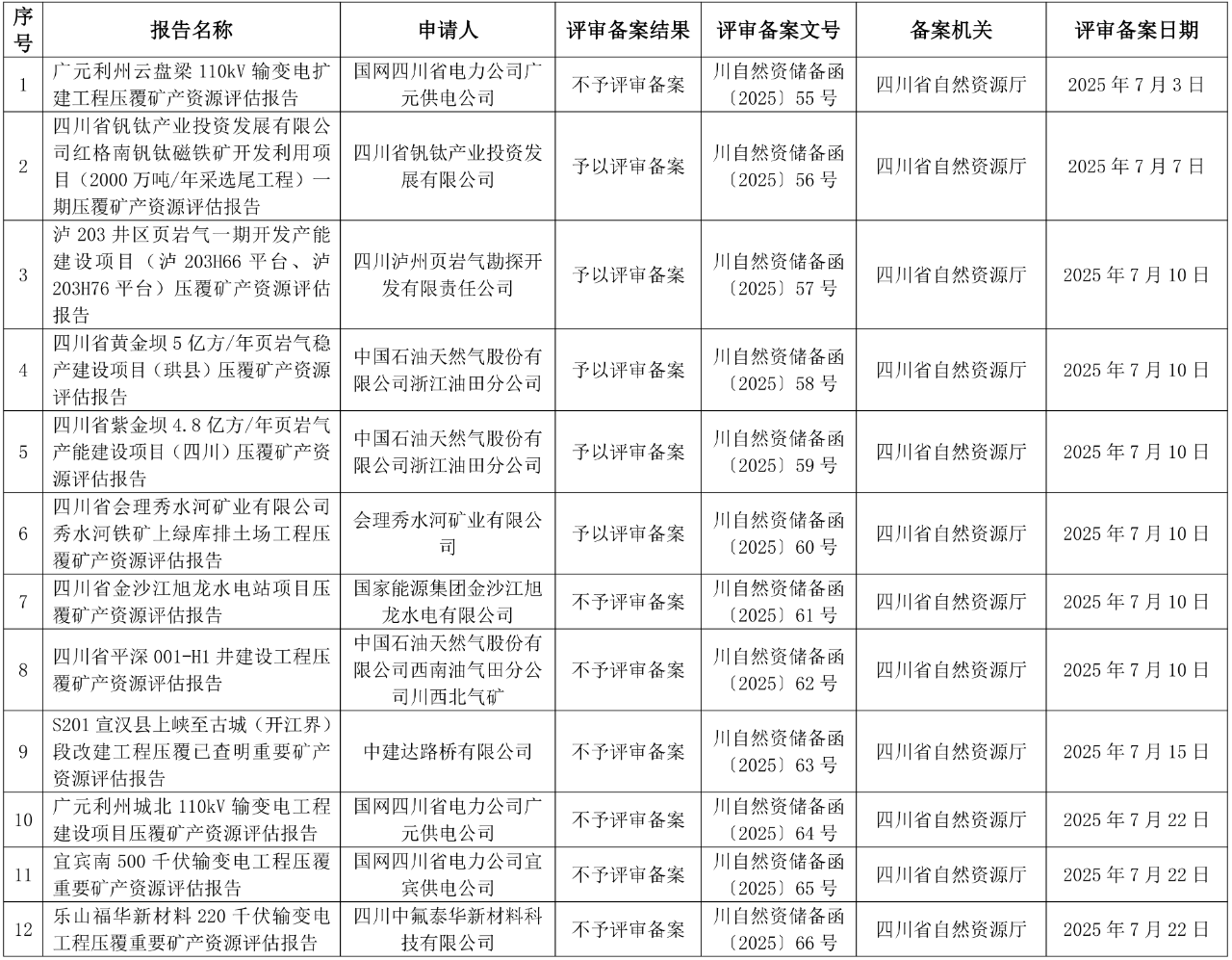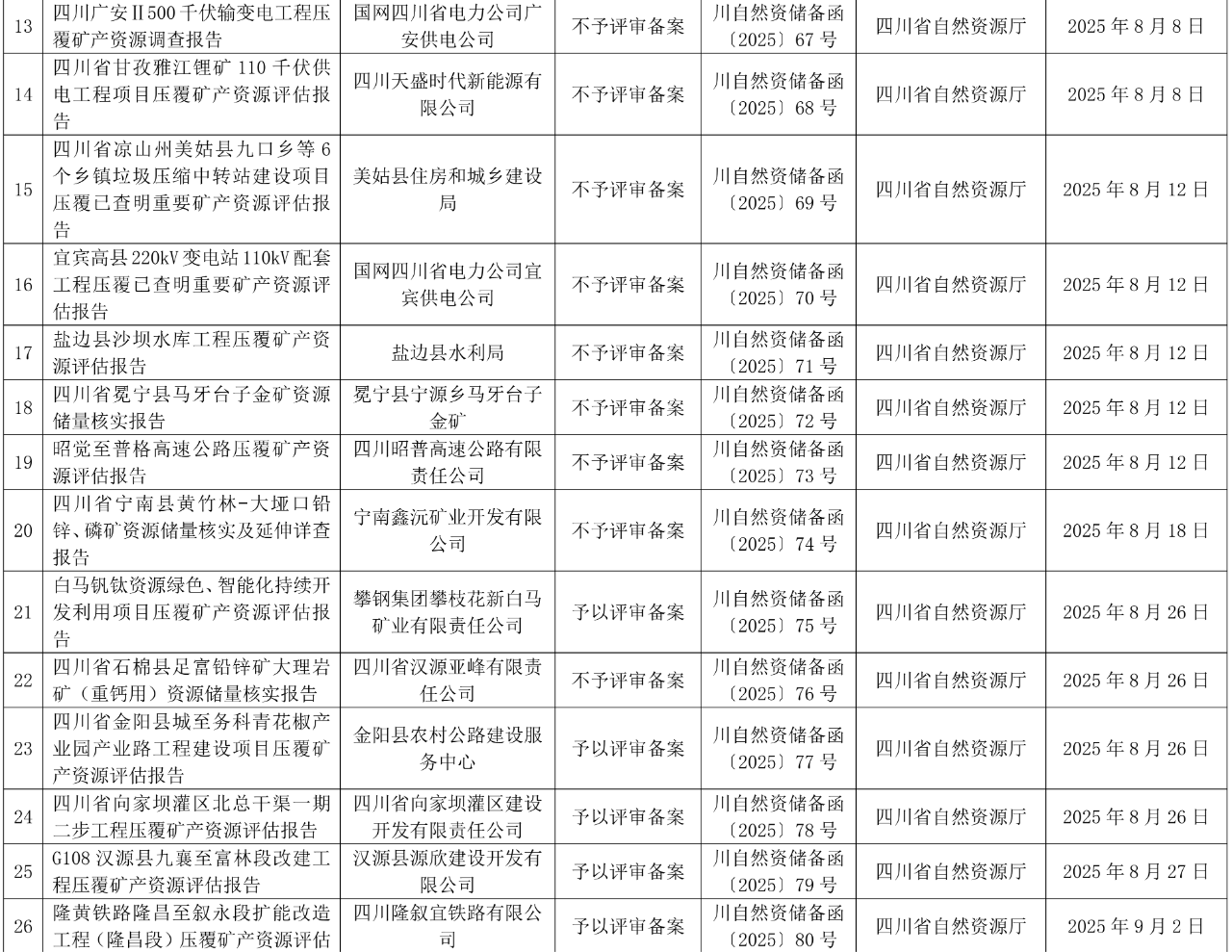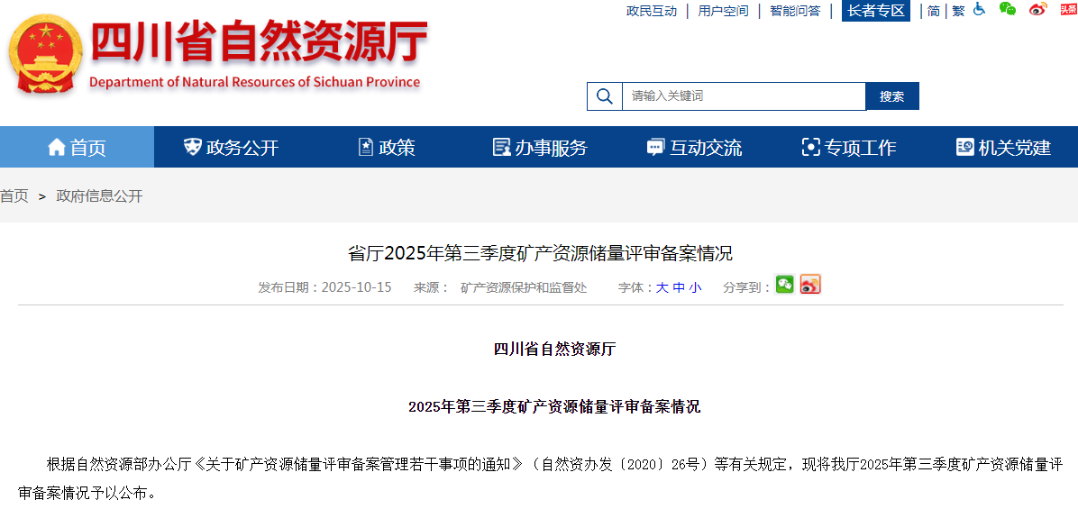23个不予备案!四川省自然资源厅公布2025年第三季度矿产资源储量评审备案情况