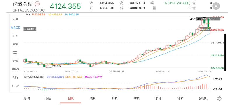 四川发布客户端消息 10月21日晚间,现货黄金跳水,盘中一度跌超6%,最低报4080.87美元/盎司,创自2013年4月以来的最大单日跌幅。此外,现货白银也大跌8.17%,报48.106美元/盎司。值得注意的是,10月以来,伦敦金现货价格站上4000美元/盎司、4200美元/盎司,并持续上行冲破4300美元/盎司,屡创历史新高,成为市场焦点。