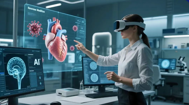 入选作品中,35幅AI作品尤为引人注目。职工周巧旻的AI作品《奔跑吧,成都》充满奇思妙想:机械熊猫与小朋友欢乐互动,机器人、机器狗并肩参加马拉松……“我想表现科技不是冷冰冰的,它可以很温暖,成为我们生活中的伙伴,”作者周巧旻在采访中分享道,“我希望通过作品传递出成都这座公园城市在科技赋能下的活力与包容。”另一组作品《AI赋能医疗新视界》则展现了科技的人文关怀。通过AI生成的未来医疗场景,呈现出智能手术、远程诊断、精准康复等画面,勾勒出科技如何为生命健康保驾护航的愿景。
