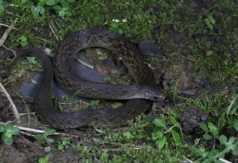 调查数据显示,华西颈斑蛇具有典型的日行性特征,属于小型无毒蛇类,主要以蚯蚓和蛞蝓为食。其颈部有独特的倒“V”形斑纹,背部呈橄榄色。
