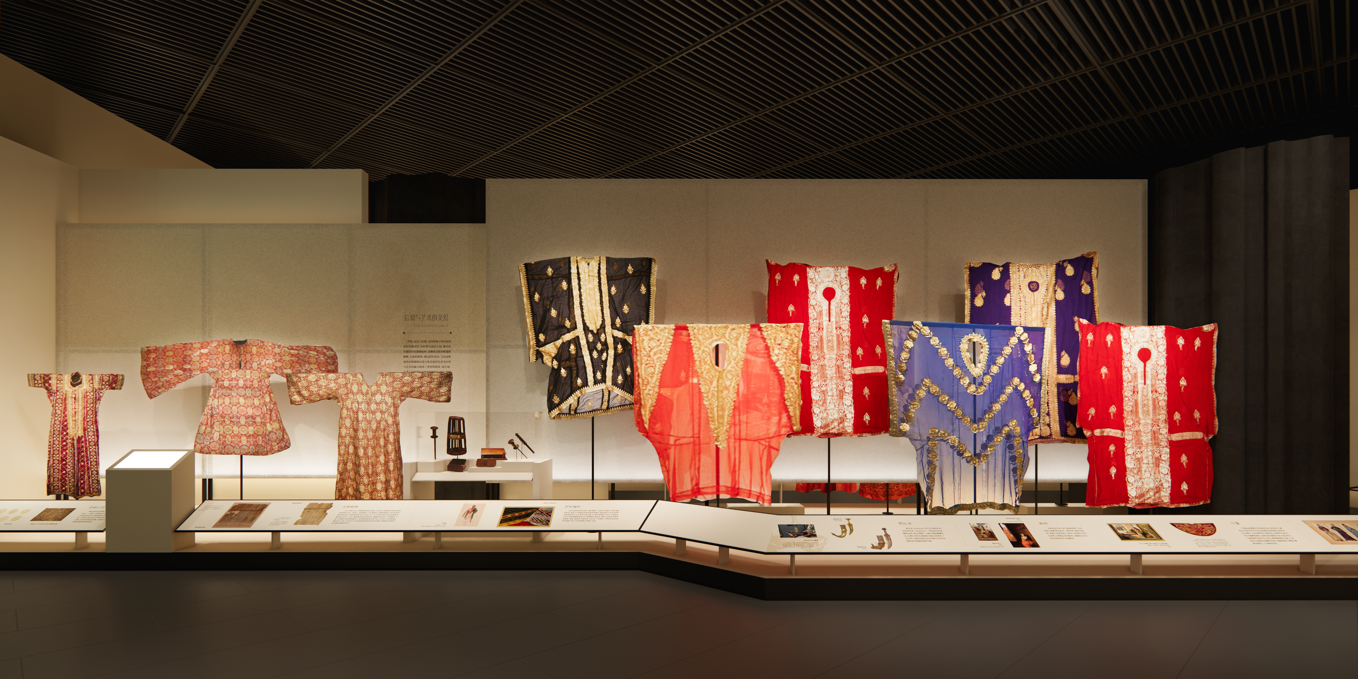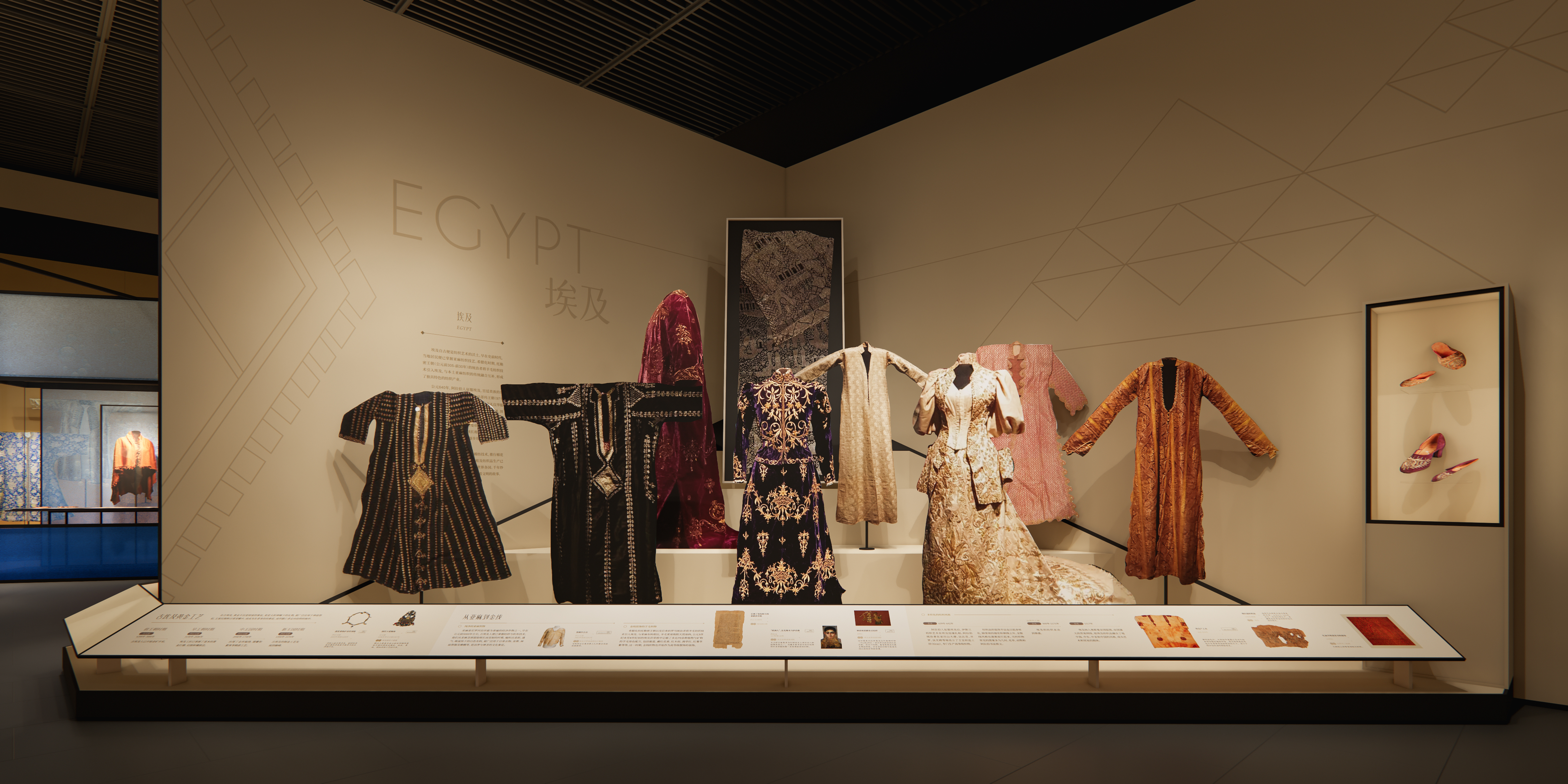在展览中,观众将看到:“日落之地”非洲马格里布的卡夫坦长袍镶金嵌玉,华美无匹;尼罗河畔的埃及婚服与穆勒鞋上,金线织就永生之梦;拜占庭王朝以紫螺染就紫色丝绸,以金线彰显崇高王权;阿拉伯人用金线演绎《一千零一夜》的绮梦,升起永不陨落的新月;波斯帝国的锦缎上金色的生命树生机勃勃,循环永恒;“衣冠王国”中国更以神乎其技的织锦、刺绣工艺,将丝绸与加金纺织工艺结合,展现出华美的东方气韵……
