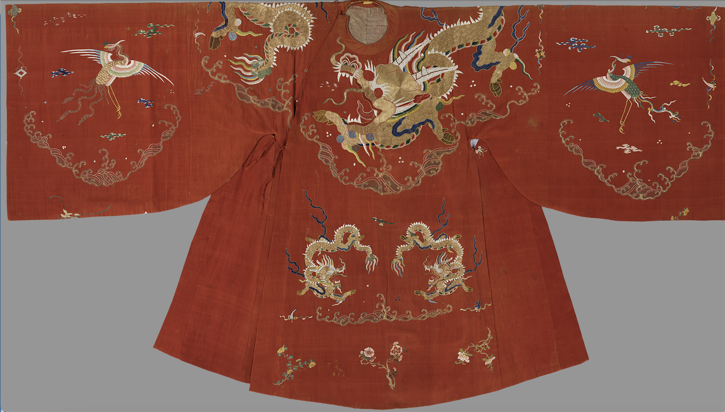 大红色绸绣过肩麒麟鸾凤纹女袍 明 山东博物馆藏