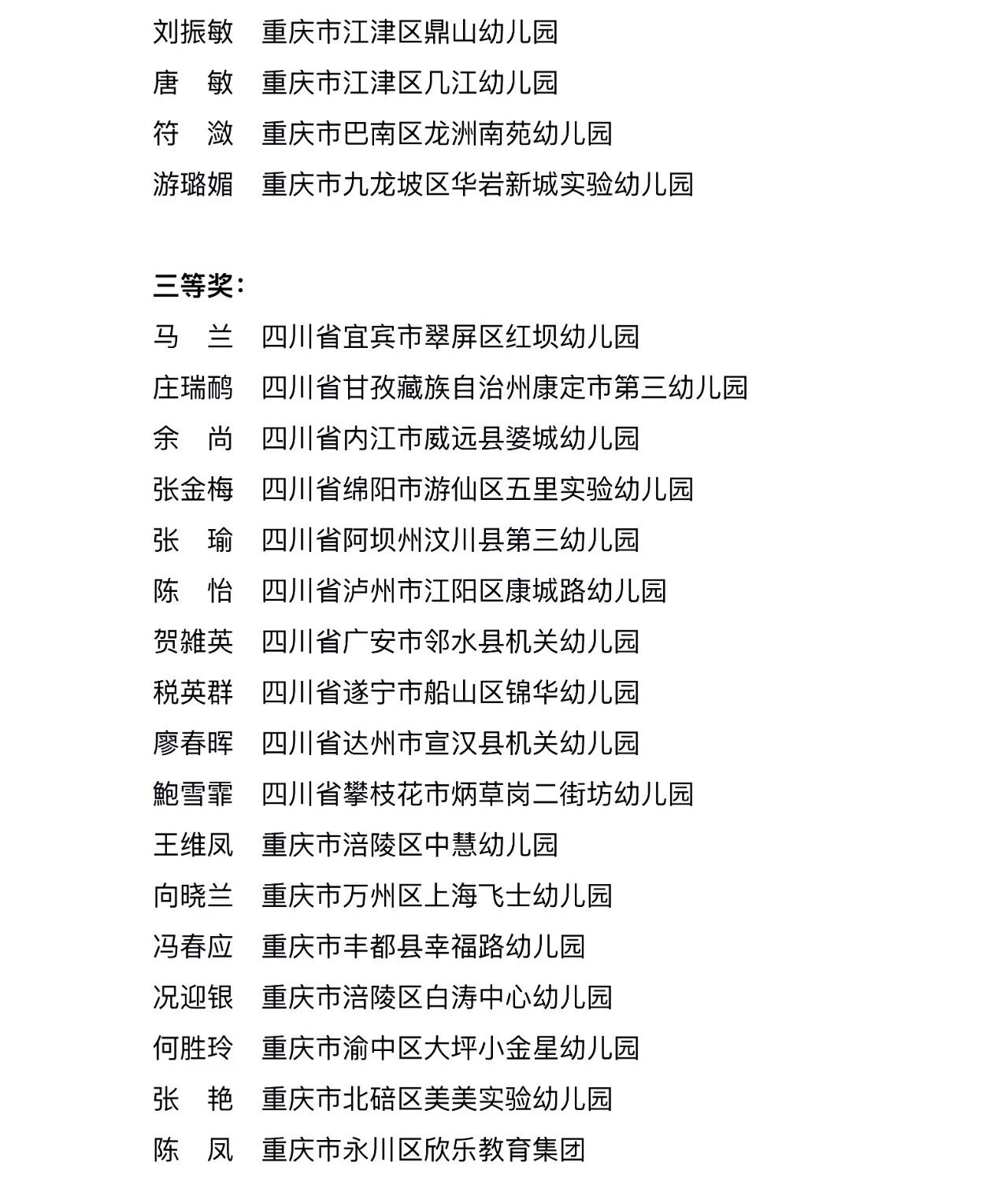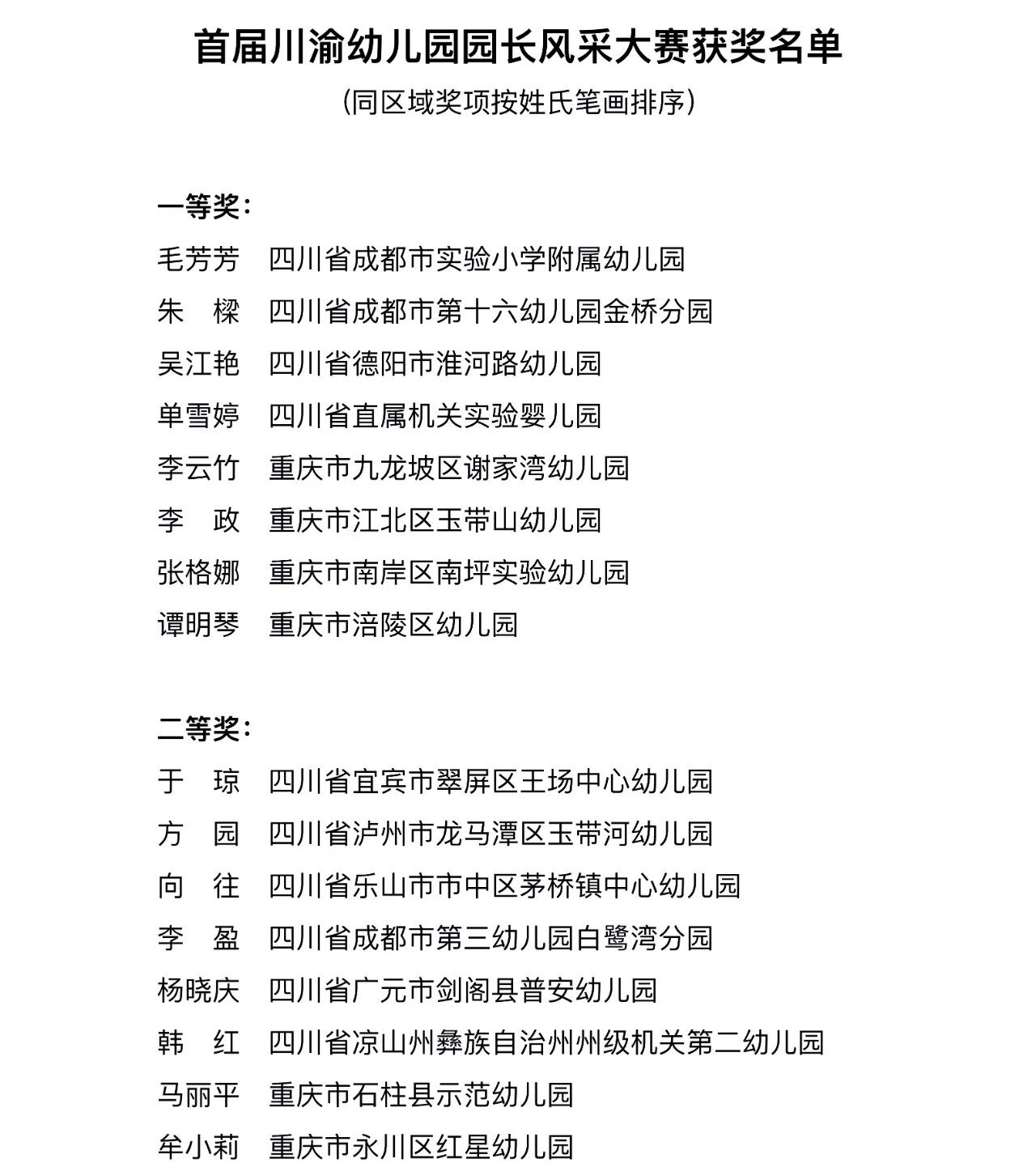 近日,由重庆市教育委员会与四川省教育厅联合主办的首届川渝幼儿园园长风采大赛颁奖仪式在重庆市永川区举行,现场揭晓并颁发了首届川渝幼儿园园长风采大赛一、二、三等奖。跟小编一起来看获奖名单──