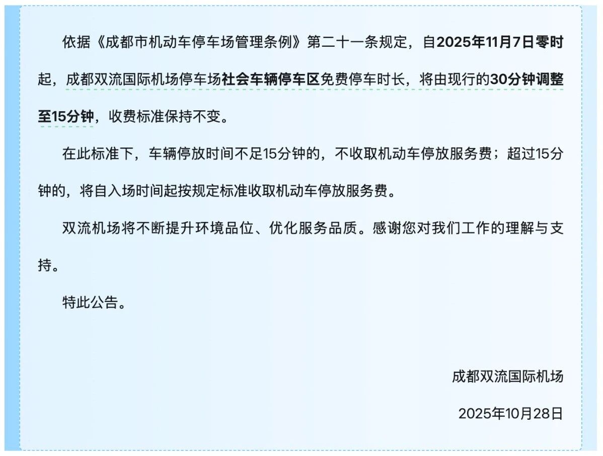 成都双流国际机场在公告中称,依据《成都市机动车停车场管理条例》第二十一条规定,自2025年11月7日零时起,成都双流国际机场停车场社会车辆停车区免费停车时长,将由现行的30分钟调整至15分钟,收费标准保持不变。