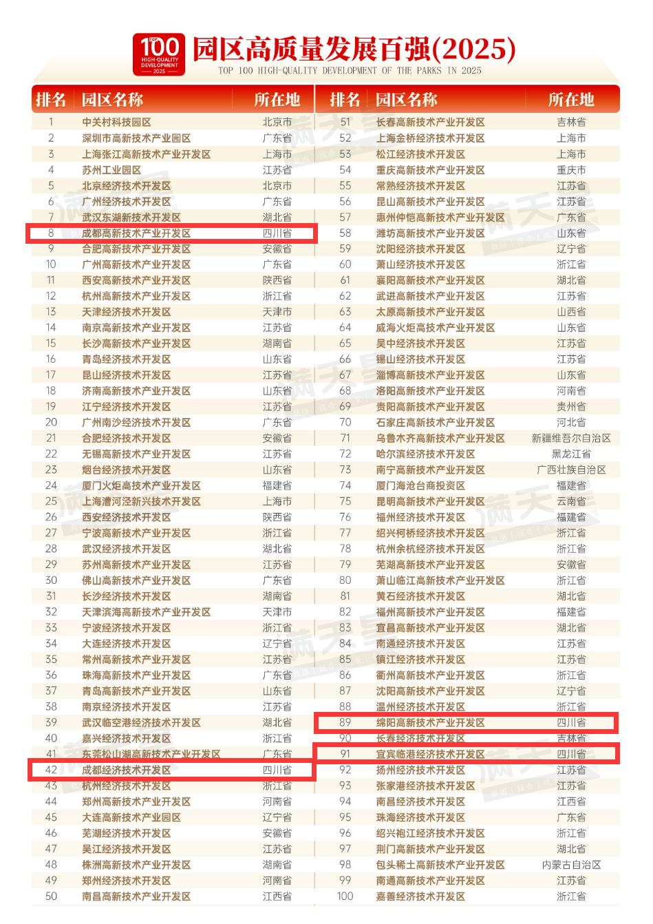 四川发布客户端消息 10月29日,赛迪顾问发布《2025年中国园区经济高质量发展研究》和园区高质量发展百强(2025)榜单。其中,四川有4个园区上榜,成都高新技术产业开发区排第8名,成都经济技术开发区排第42名,绵阳高新技术产业开发区排第89名,宜宾临港经济技术开发区排第91名。
