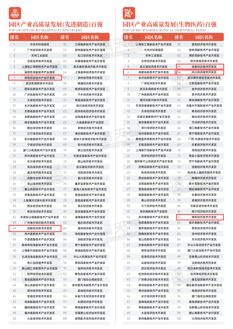 此外,成都高新技术产业开发区、成都经济技术开发区还入围了园区产业高质量发展(先进制造)百强榜单;成都高新技术产业开发区、成都经济技术开发区、内江经济技术开发区、绵阳经济技术开发区入围园区产业高质量发展(生物医药)百强榜单。
