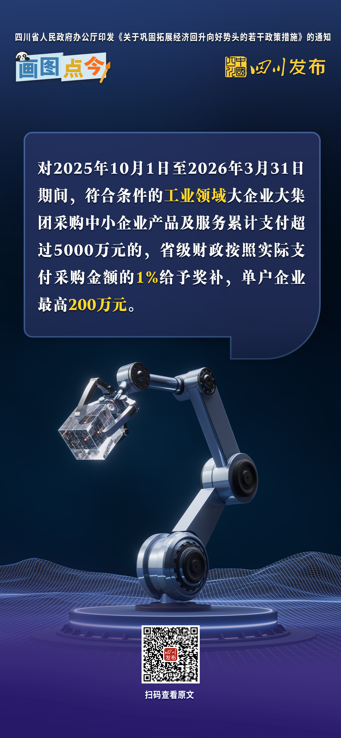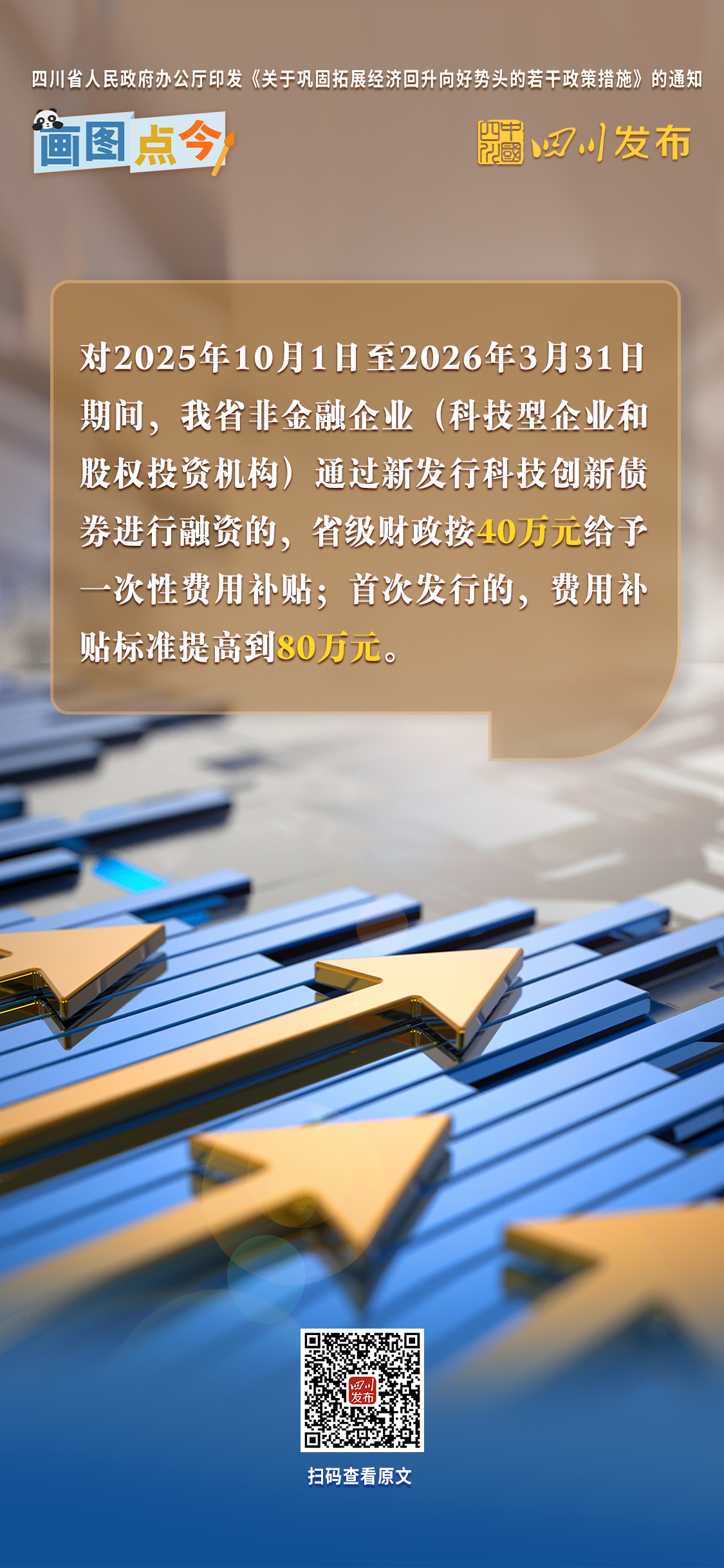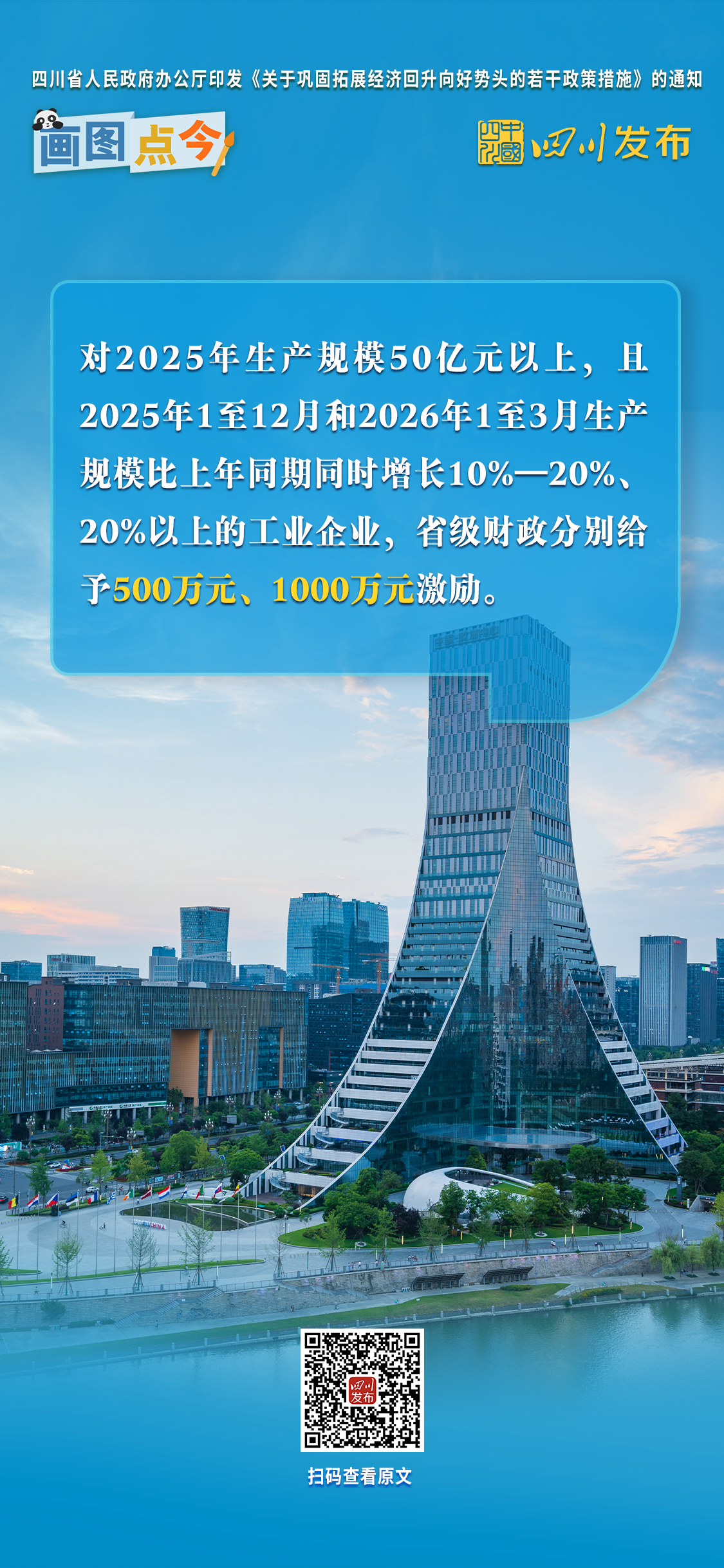 四川发布客户端消息 今日,省政府办公厅印发《关于巩固拓展经济回升向好势头的若干政策措施》,从大力支持消费提振、帮助企业降本减负、推进企业快速成长、促进产业转型升级四方面提出18条奖补、激励等具体措施。一组海报带你get√