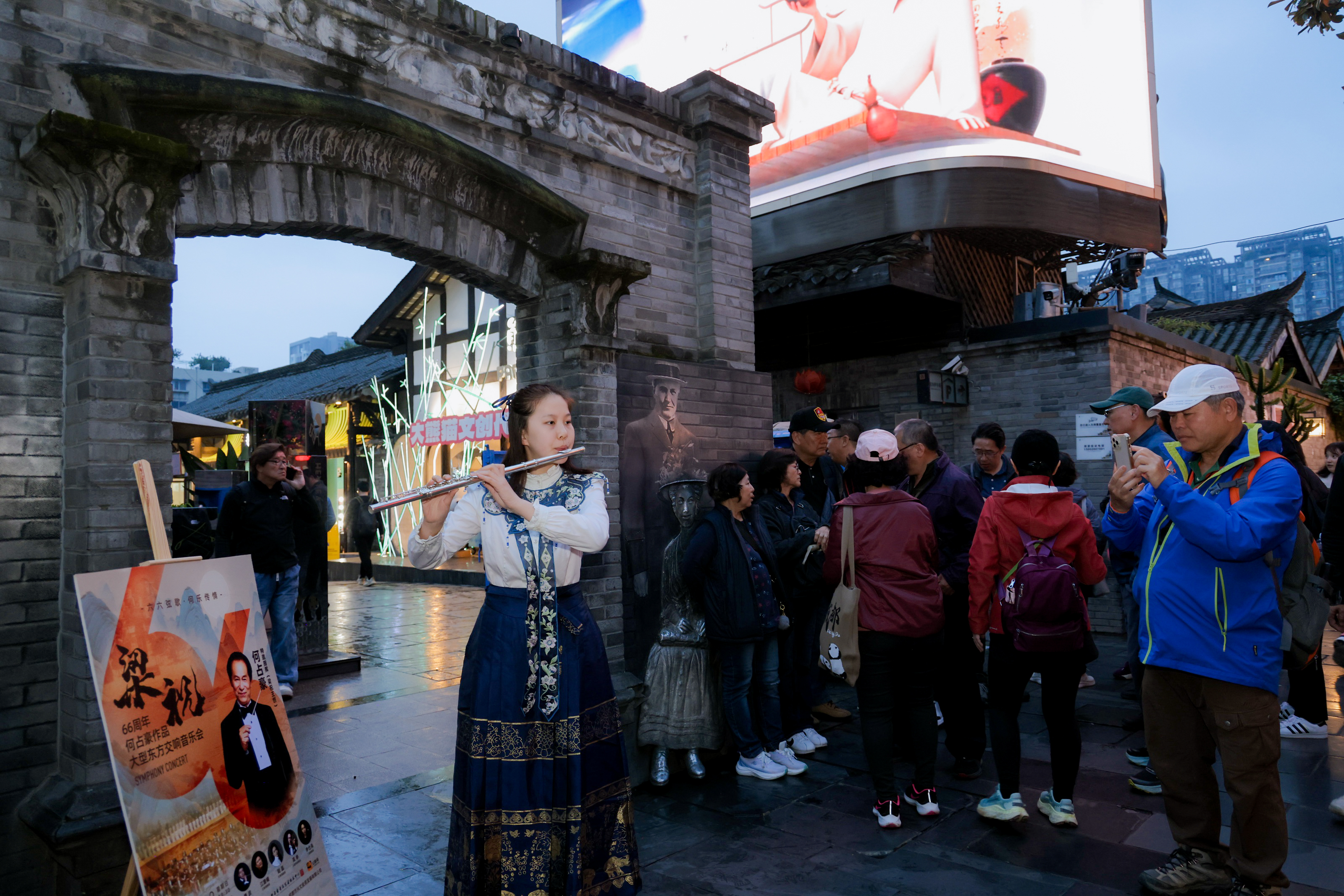 四川发布客户端消息 作为第三十一届“蓉城之秋”成都国际音乐季的重头戏,11月2日,“六六弦歌·何乐传情”《梁祝》66周年何占豪作品交响音乐会将在金沙国际音乐厅上演。10月31日,在音乐会前夕,“梁祝”主题音乐快闪在宽窄巷子街巷内奏响,吸引众多市民游客驻足聆听。