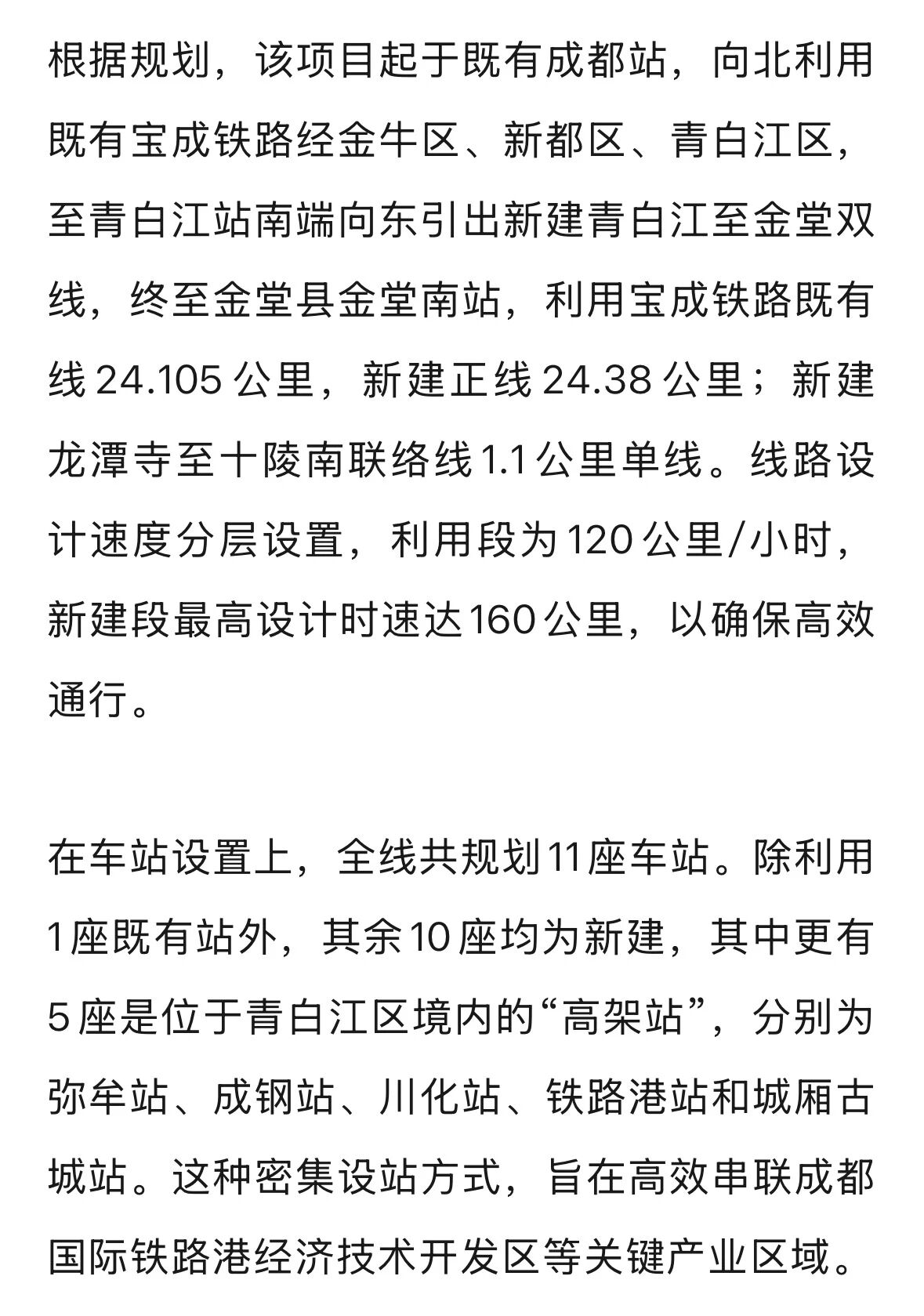 项目建成后,将采用公交化运营模式,有效缩短成都“5+2”城区与青白江、金堂的时空距离,更好服务沿线居民便捷、高效的出行需求,助力形成“半小时通勤圈”。