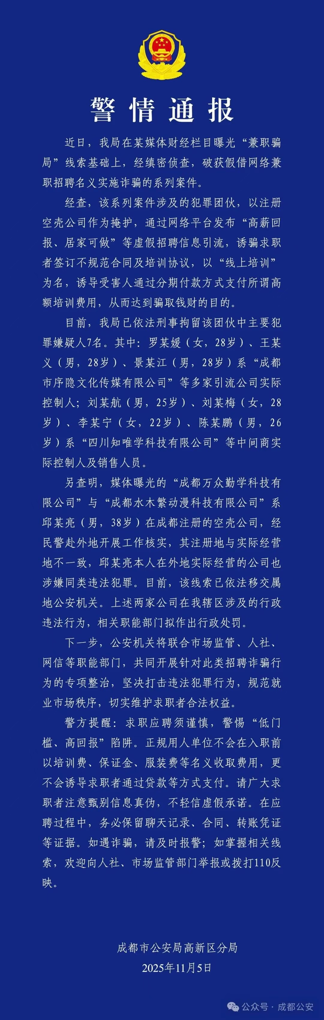 成都警方:网络兼职招聘诈骗案告破!7人被刑拘