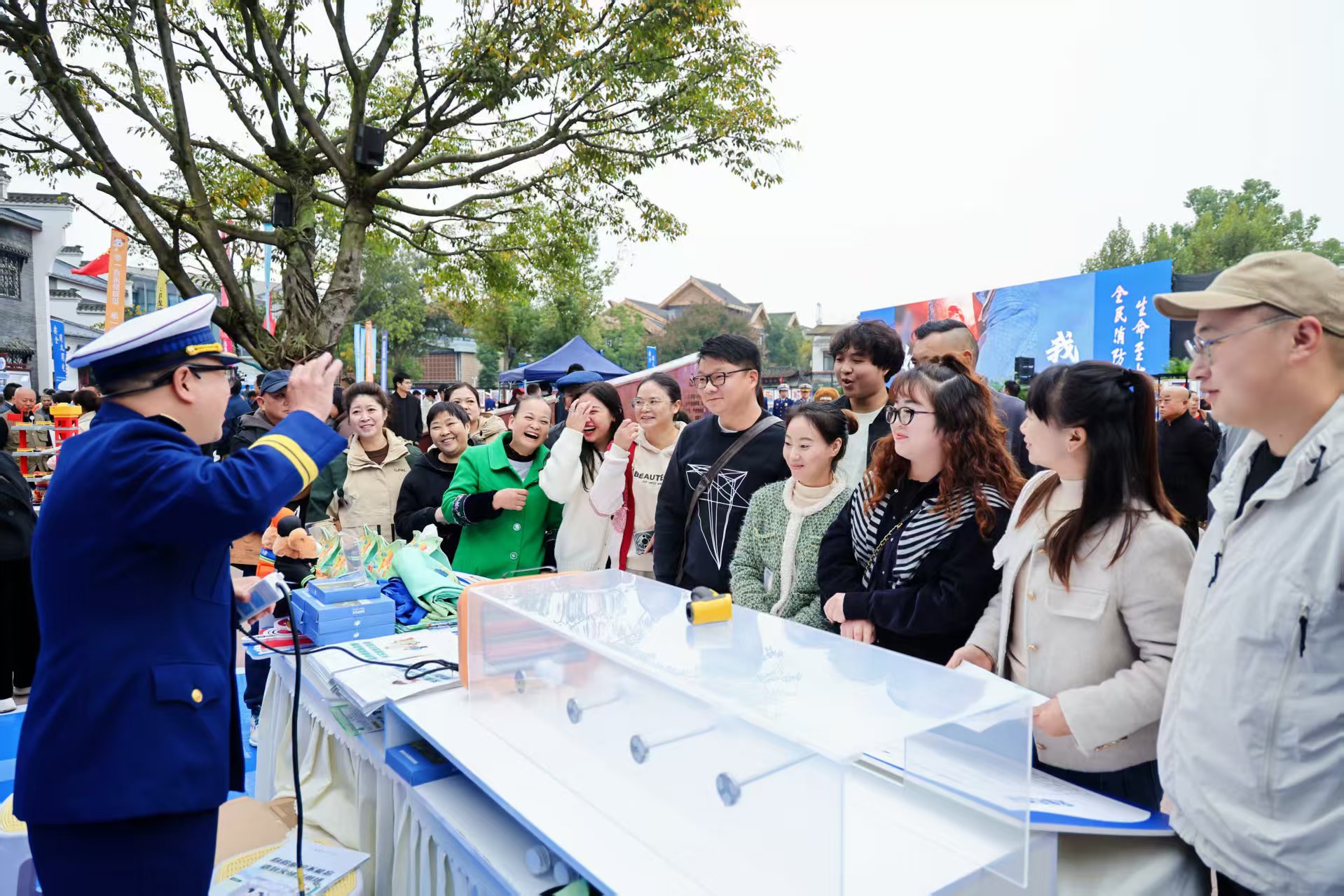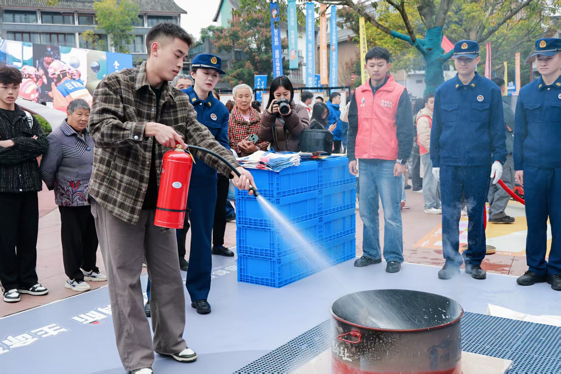 启动仪式现场还设置了“消防赶大集”体验展示区域。通过现场实验、技能实操、游戏互动等多种形式科普生活中常见的消防安全知识,村民排队参与打卡,通过答题体验的方式领取文创产品,学习消防安全知识。