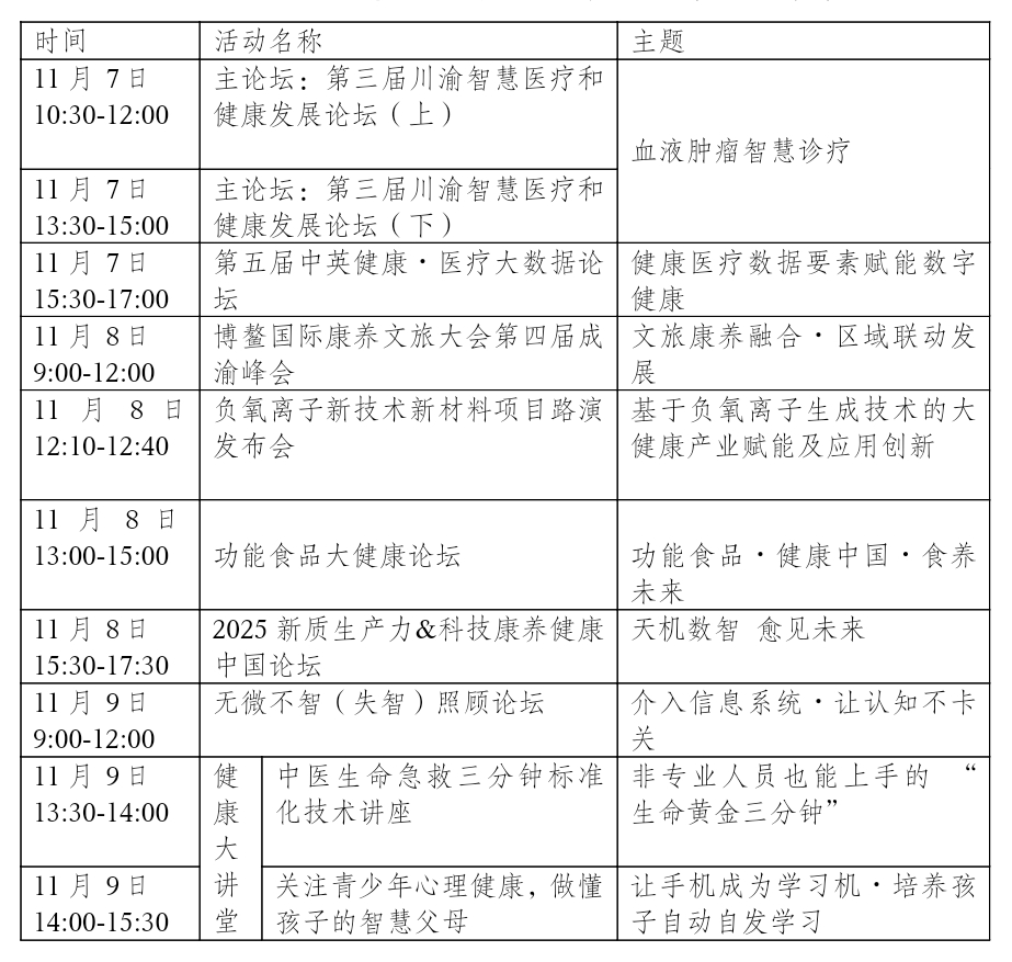 作为展会核心亮点,本届健博会重磅推出多场高水平论坛与特色活动,搭建跨学科、跨区域的交流合作桥梁。其中,11月7日启幕的主论坛──第三届川渝智慧医疗和健康发展论坛,以“血液肿瘤前沿与智慧诊疗人工智能”为主题,汇聚北京大学肿瘤医院、四川大学华西医院、重庆大学附属肿瘤医院等权威专家学者、技术研发精英与企业代表,通过主题演讲、案例分享与互动研讨,聚焦 AI 技术在疾病筛查、诊断治疗与预后管理中的创新应用,助力川渝地区血液肿瘤智慧诊疗水平提升,呼应川渝生物医药领域 “揭榜挂帅” 的创新合作机制。