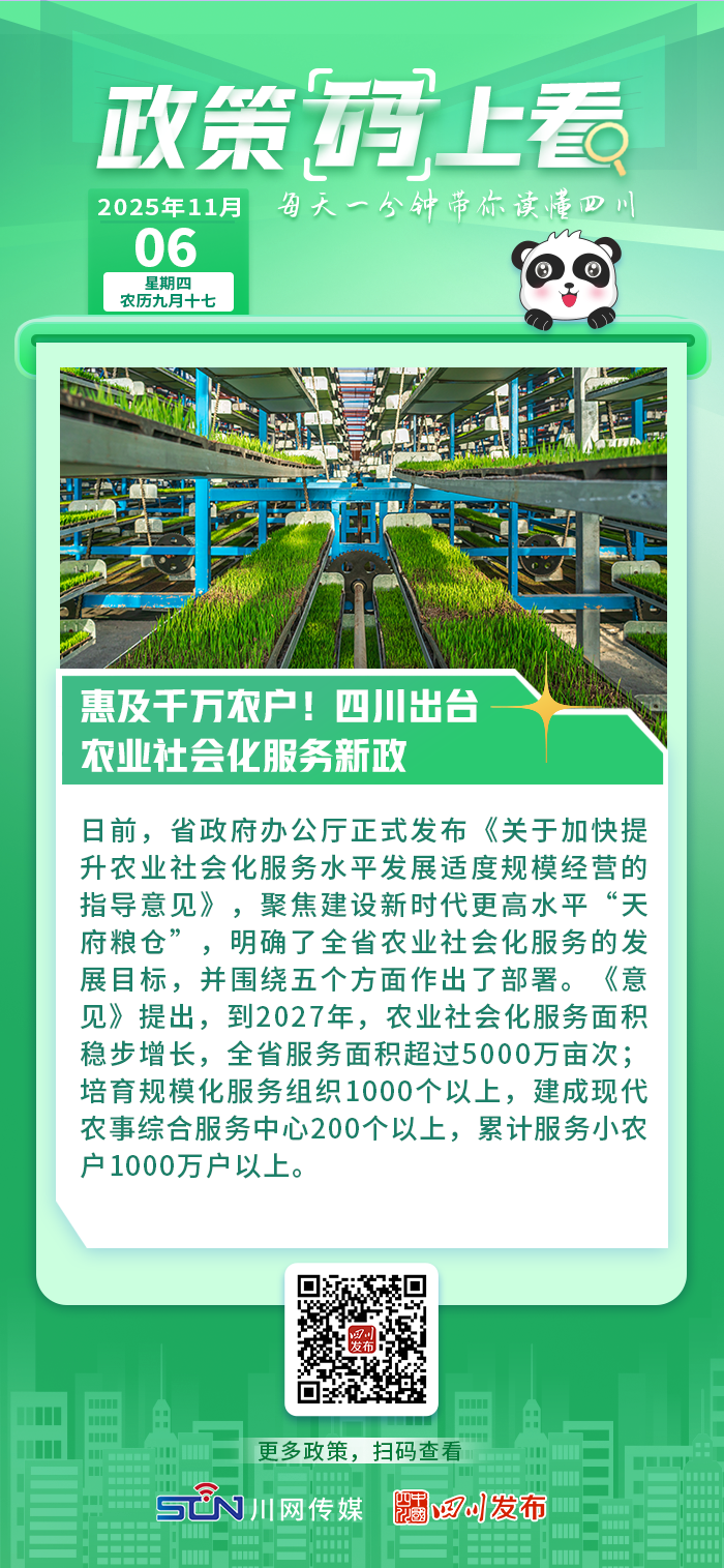 《意见》提出,到2027年,农业社会化服务面积稳步增长,全省服务面积超过5000万亩次;培育规模化服务组织1000个以上,建成现代农事综合服务中心200个以上,累计服务小农户1000万户以上。到2030年,形成服务网络健全、链条覆盖全面、区域发展协调、经营规模适度、农户受益广泛的农业社会化服务发展新格局。
