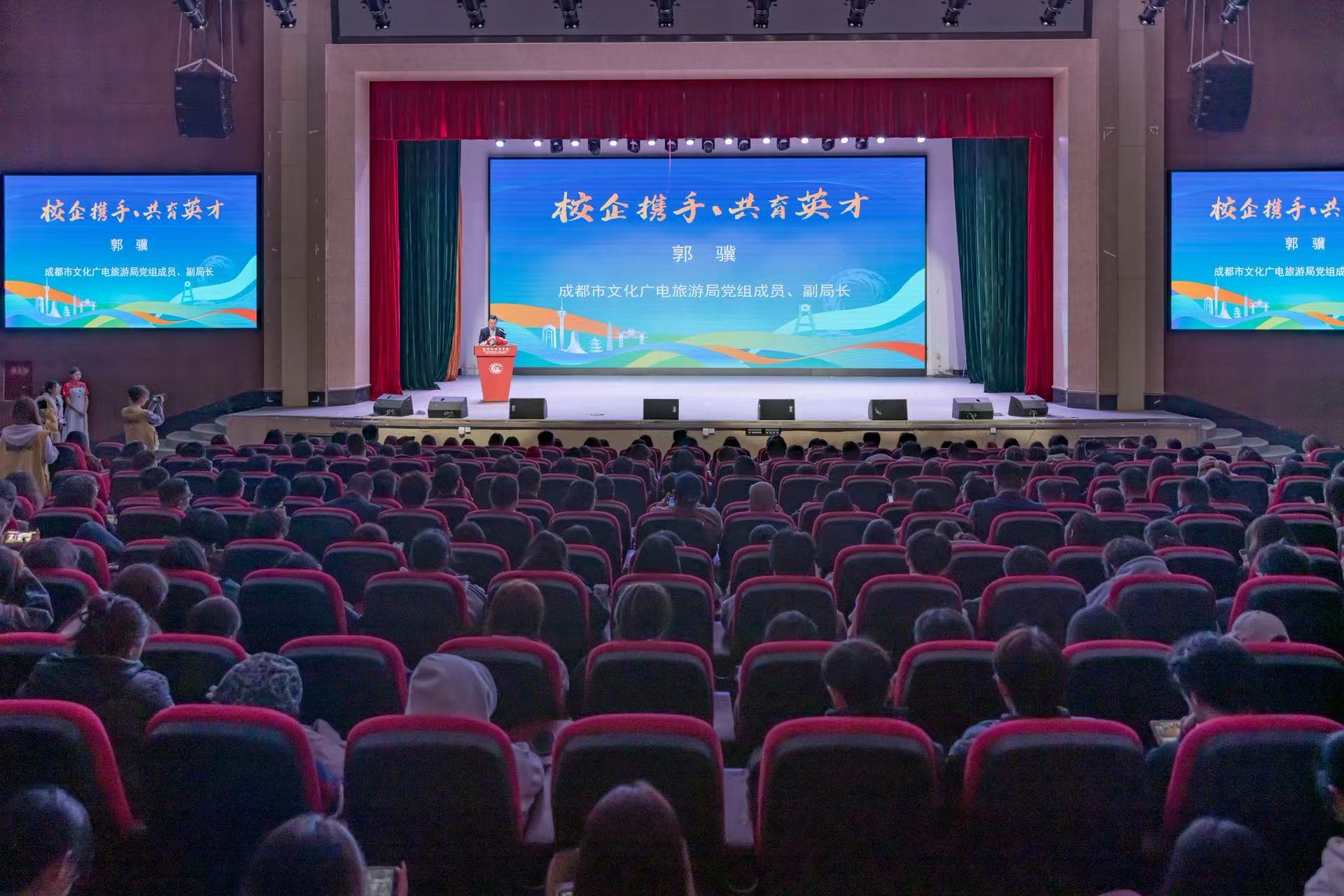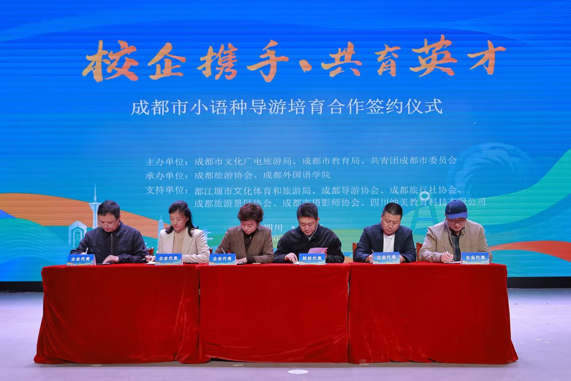 四川发布客户端消息 11月7日,“校企携手,共育英才──成都市小语种导游培育合作签约仪式”在成都外国语学院举行。活动由成都市文化广电旅游局、成都市教育局、中国共产主义青年团成都市委员会联合主办,成都外国语学院联合成都旅游协会共同承办,20家旅游企业协办,紧扣成都建设世界文化名城、打造国际旅游目的地的核心目标,创新构建“政校企协”四方协同育人体系。这一举措不仅为提升城市文旅国际化服务能级注入强劲动力,更标志着成都文旅人才培育正式迈入规模化、系统化、高品质发展新阶段。相关领导嘉宾,20家旅游企业代表,院校师生代表及媒体朋友共600余人齐聚现场,共同见证这一关乎成都文旅产业高质量发展的重要时刻。