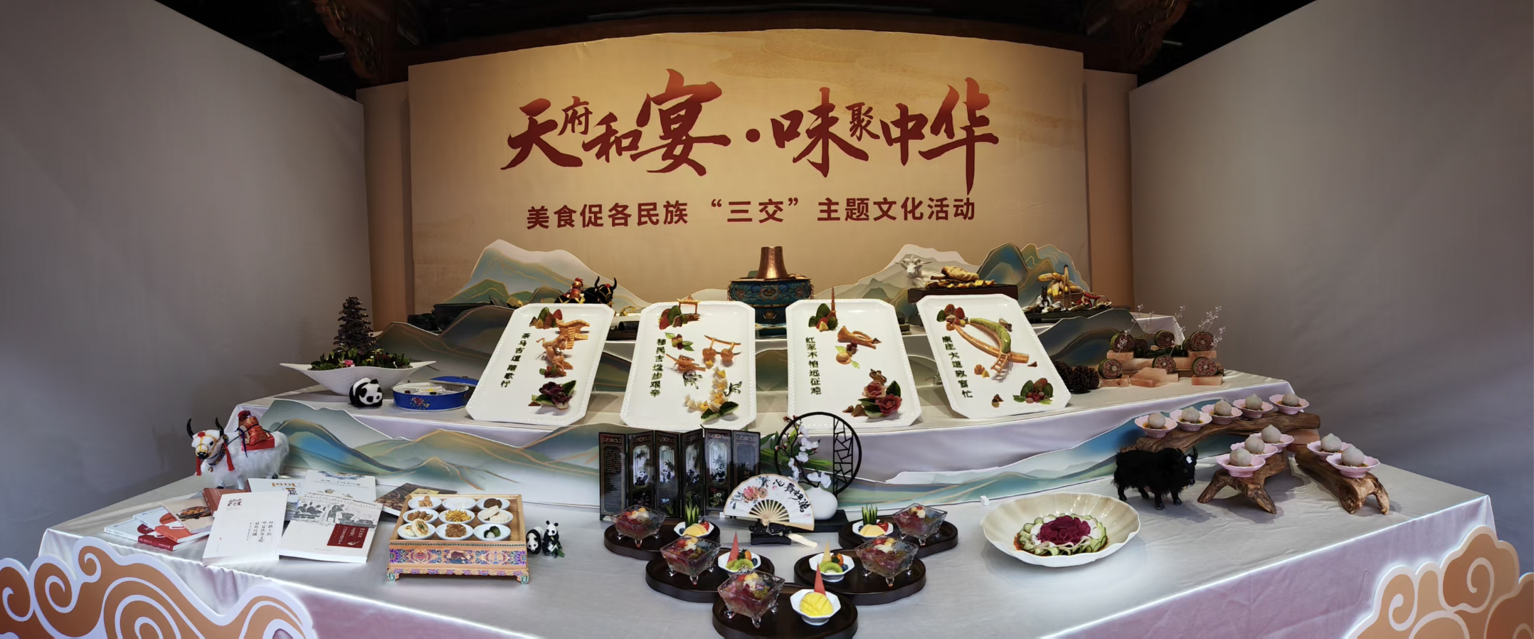 活动围绕铸牢中华民族共同体意识主线,以“天府”为空间基底,以“和”为精神内核,以“味”为表达媒介,展现山河馈赠之“鲜”,演绎民族情感之“醇”,通过美食讲述各民族交往交流交融的生动故事。在“前韵·共启”“主章·交融”“尾声·同心”三个章节中,通过专家讲解、菜品制作、嘉宾品鉴等方式,展示了《五色五味齐和鸣》《花开富贵国昌盛》《江源同炉聚福锅》《九州珍馔汇同心》等10余道创意菜品,让在场观众完成了一场从舌尖到心尖的文化旅程。