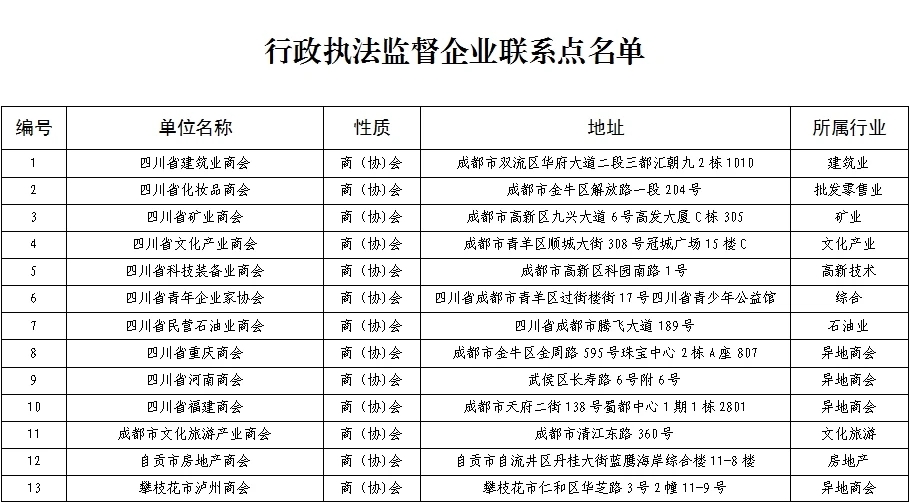 四川发布客户端消息 11月8日,记者从司法厅获悉,为深入贯彻落实党中央、国务院的决策部署,建立健全涉企行政执法监督工作机制,畅通企业诉求表达渠道,依法保护民营企业产权和企业家合法权益,促进严格规范公正文明执法,为全省经济高质量发展提供有力的法治保障。根据《四川省司法厅 四川省工商业联合会关于进一步加强涉企行政执法监督工作的通知》要求,司法厅与省工商联共同确定了四川省建筑业商会等31家商(协)会、通威股份有限公司等28家企业作为行政执法监督企业联系点。