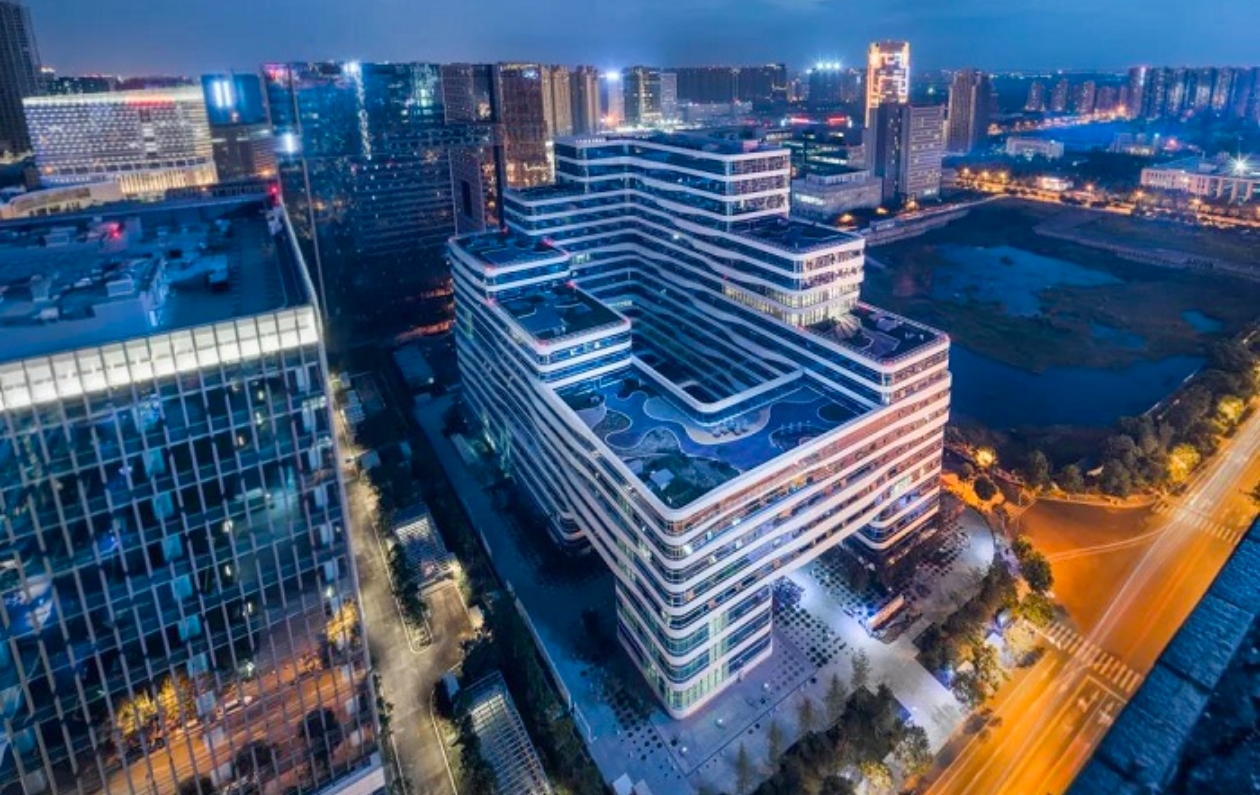 以中建滨湖设计总部为例,项目总建筑面积约7.8万平方米,集成应用近40项绿色低碳技术,构建了从设计到运行全过程的节能体系。整体设计顺应场地与气候条件,体量逐层退台,形成良好的通风采光格局。场地采用本土植物和海绵城市技术构建生态循环体系,每年可减少二氧化碳排放约1000吨、节约用水约1700吨。屋顶铺设的865平方米光伏组件,为办公及照明提供清洁电力。依托自然通风、高性能围护结构等被动设计,以及光储直柔系统和高效机电设备等主动设计,形成了综合节能体系。