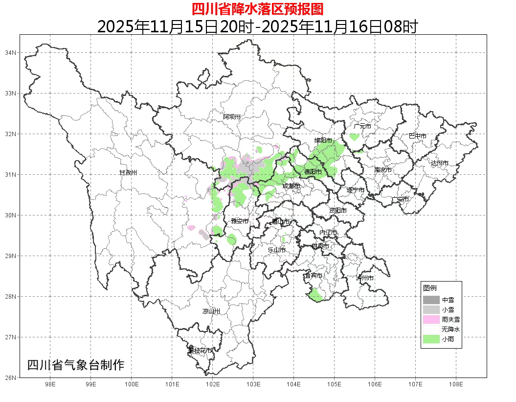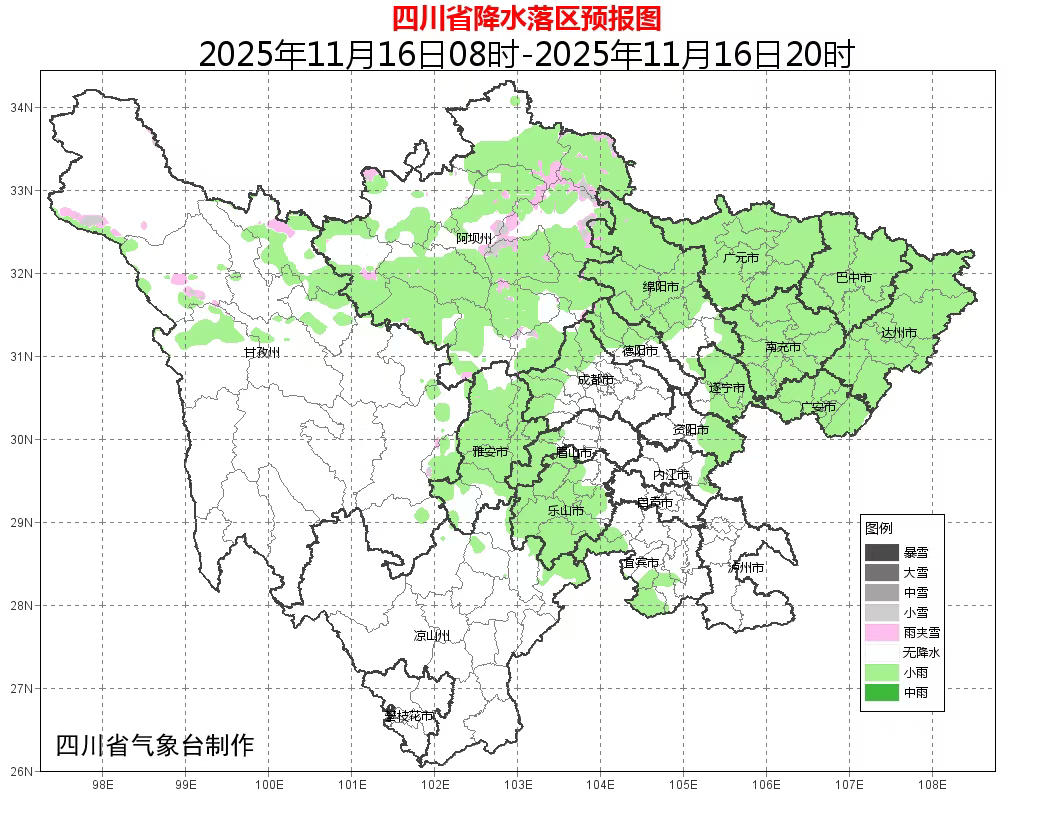 今天晚上:盆地大部多云间阴,西部南部局地有小雨或零星小雨;甘孜州东部、阿坝州南部多云间阴有阵雨(雪),川西高原其余地方和攀西地区大部晴间多云。