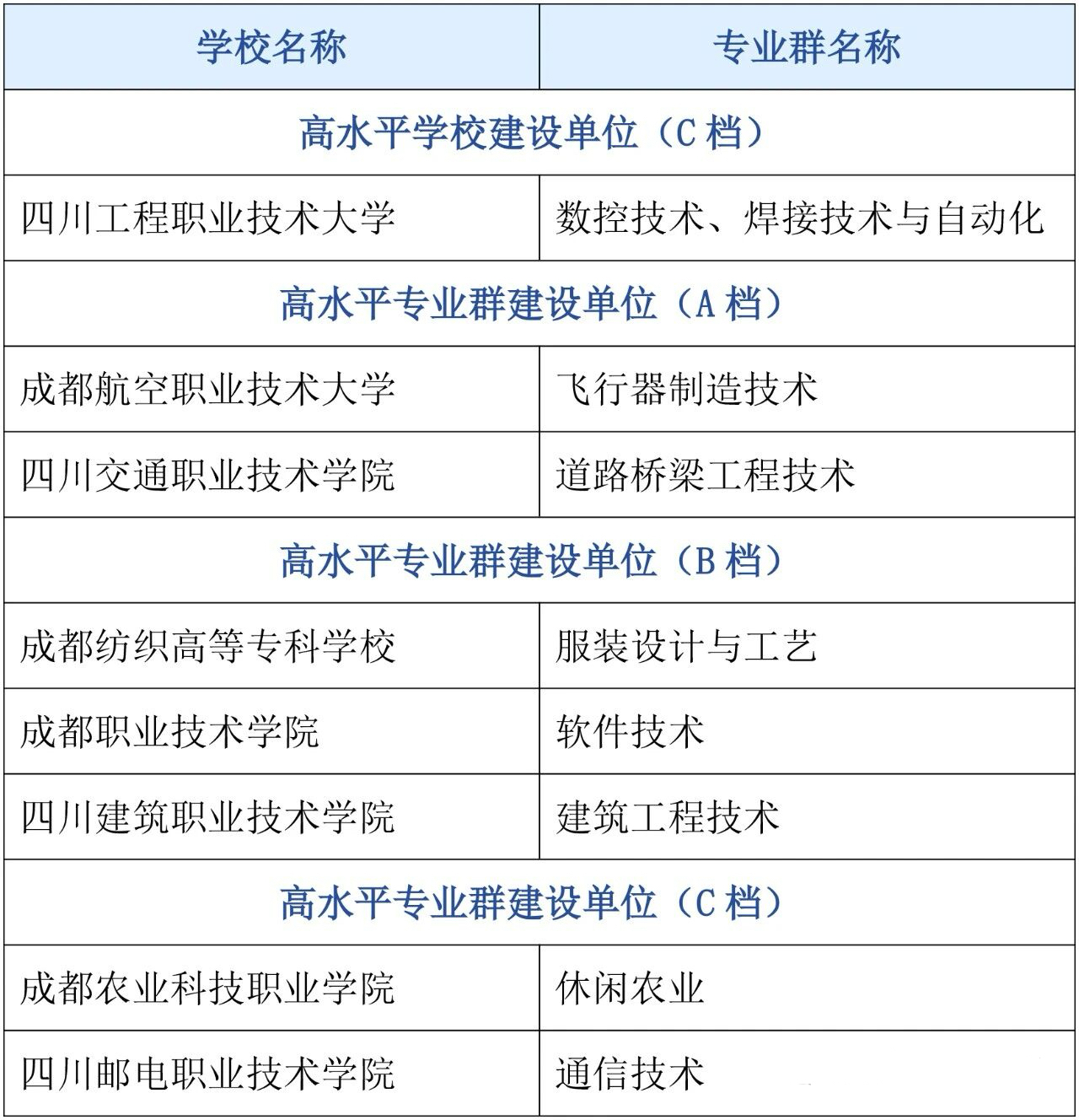据了解,“双高计划”每五年为一个支持周期。在2019年启动的首轮建设中,四川省共有8所高校入选,包括此次再度入选的院校及成都航空职业技术大学、四川交通职业技术学院等,其专业群覆盖了通信技术、软件技术、飞行器制造技术、休闲农业等多个领域。