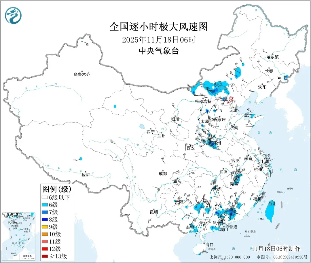 同时,内蒙古中部、西藏北部、河北北部、河南西部、江苏南部、广西东南部沿海、广东南部沿海等地部分地区有5至6级风,阵风7级;黄海南部海域、东海大部海域、台湾海峡、台湾以东洋面、巴士海峡、南海北部和中部海域、北部湾将有7至8级、阵风9至10级的大风,其中东海南部部分海域、台湾海峡、巴士海峡、南海东北部部分海域风力可达9级、阵风10至11级。中央气象台今晨继续发布大风蓝色预警。