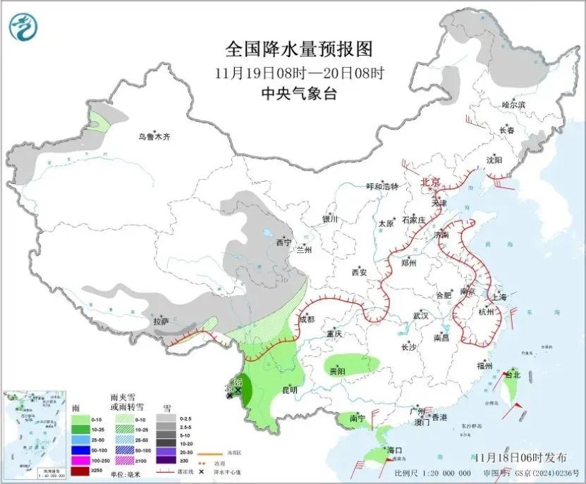 昨日(11月17日),内蒙古东北部、黑龙江东部、吉林东部、陕西南部、河南西部、青海东北部等地部分地区出现小雪或雨夹雪,局地中雪或大雪;陕西东南部、重庆中北部、湖北西部、云南东南部、广西西部等地部分地区出现中到大雨,局地暴雨。