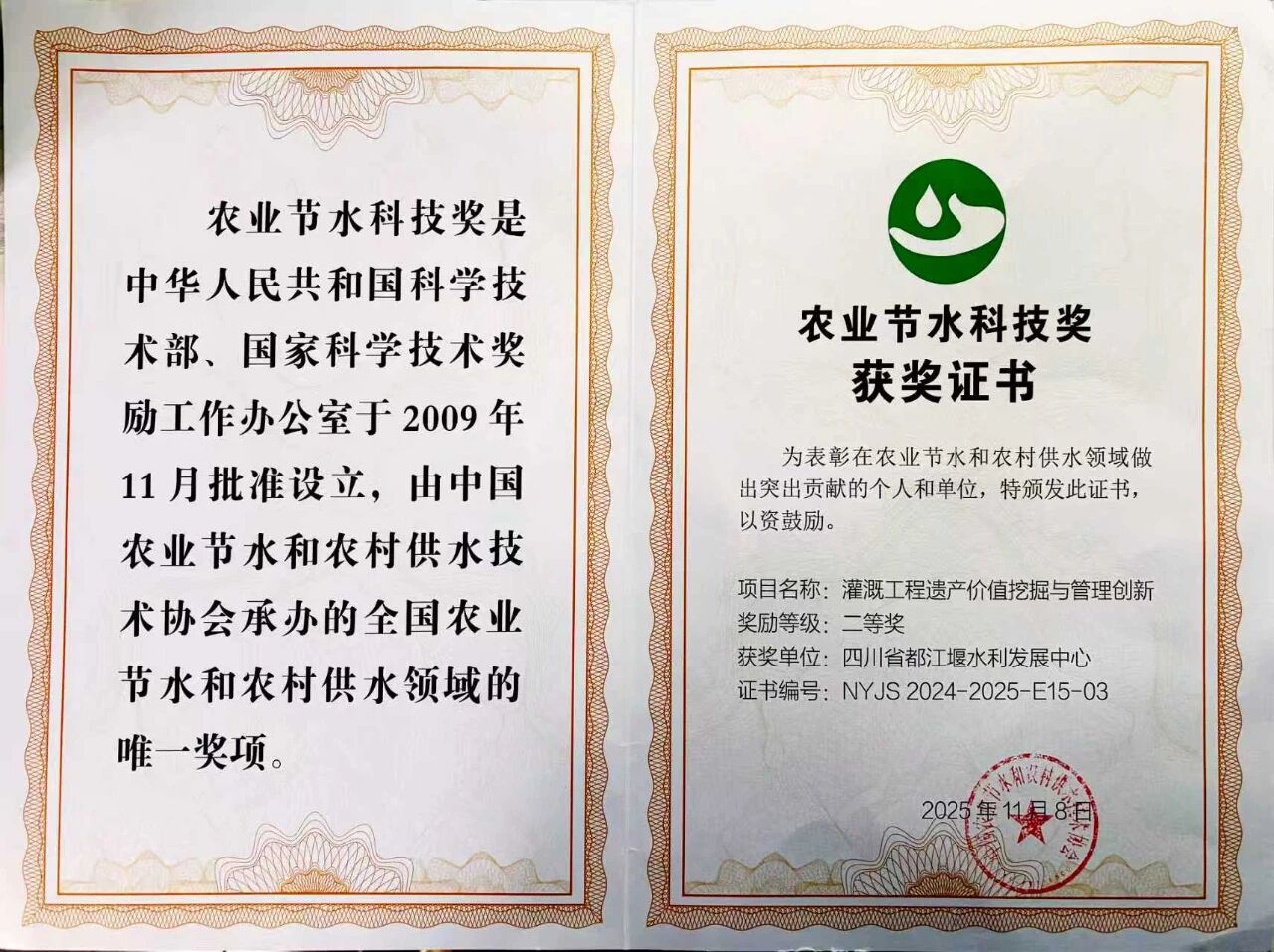 四川发布客户端消息 11月18日,记者从都江堰水利发展中心获悉,近日,在第六届农业节水和农村供水技术暨协会30周年高质量发展论坛、2024—2025年度(第十届)农业节水科技奖颁奖大会上,由四川省都江堰水利发展中心联合中国水利水电科学研究院、内蒙古河套灌区水利发展中心、宁夏回族自治区水利厅、陕西省水利厅共同参与的“灌溉工程遗产价值挖掘与管理创新”项目,荣获“农业节水科技奖”二等奖。