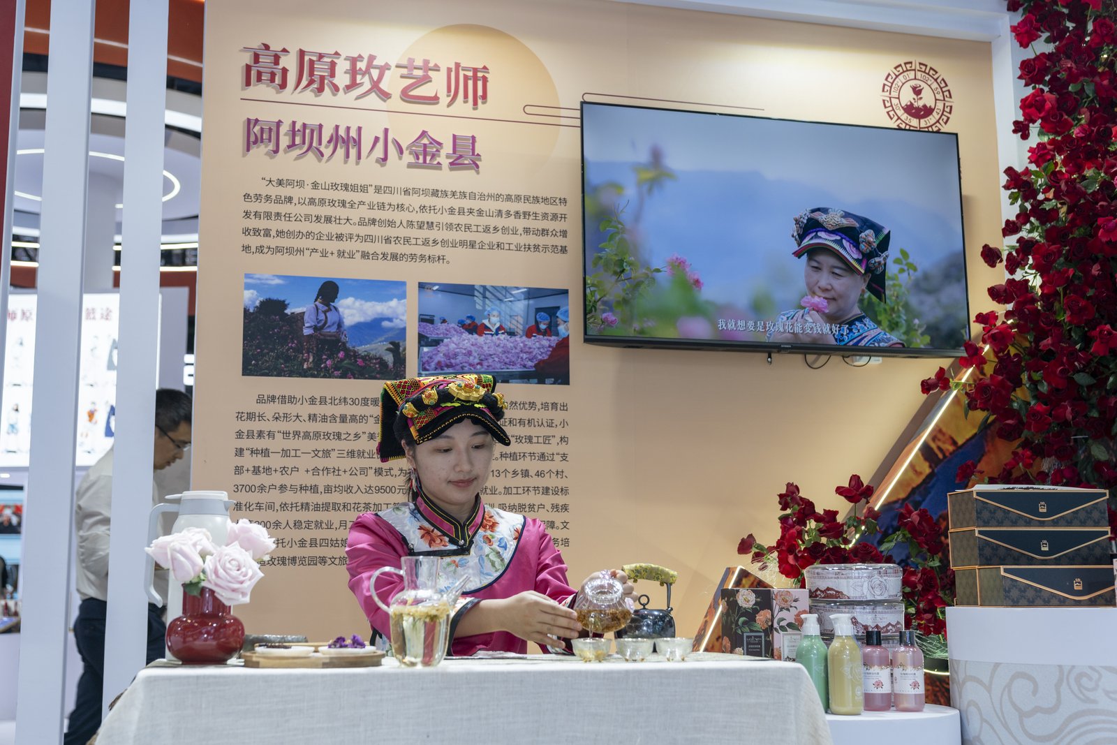 四川主体展馆“川字号”劳务品牌精彩纷呈。阿坝州“高原玫艺师” 通过“种植+加工+文旅”融合模式,带动3700余户农户增收,创建标准化车间提供200余个稳定岗位,有效促进藏族群众就地就业;凉山州“宁南茧哥丝妹” 推动产业综合产值突破31亿元,联合高校培训3.8万人次,推动千余人持证上岗,其6A级高端生丝占据国内50%市场份额,出口LV、爱马仕等国际奢侈品牌;成都市“龙泉车工”投入超2亿元建设培训体系,培养技能人才27万余人,带动产业链超10万人次就业。成都创新“共享人才”模式,实现人才在同一产业链不同区域、同一区域不同企业间合理流动和优化配置;达州市“巴蜀藤艺师”深耕非遗传承与活化,以技能培训为抓手,以企业园区为依托,以展销门店为窗口,致力“产教研”融合发展。品牌累计培育技师1600余人,藤编产业年产值超5亿元,带动“家门口”就业10万余人;内江市“威远无花果工匠”立足县内无花果一二三产业全链条融合发展的优势,培养种植加工户超5万户,带动全国超30万人次参与产业,人均年收入超8万元,威远县成为国内无花果集中成片种植面积最大产区之一,种植面积达5.2万亩、约占全国15.7%;广安市“武胜麻哥”依托市级非物质文化遗产和国家地理标志集体商标“武胜麻哥面”,每年投入1000余万元,培育产业工人3.5万余人次,孵化产业品牌20余个,全国门店突破3000家,带动就业近10万人,年人均增收近万元。