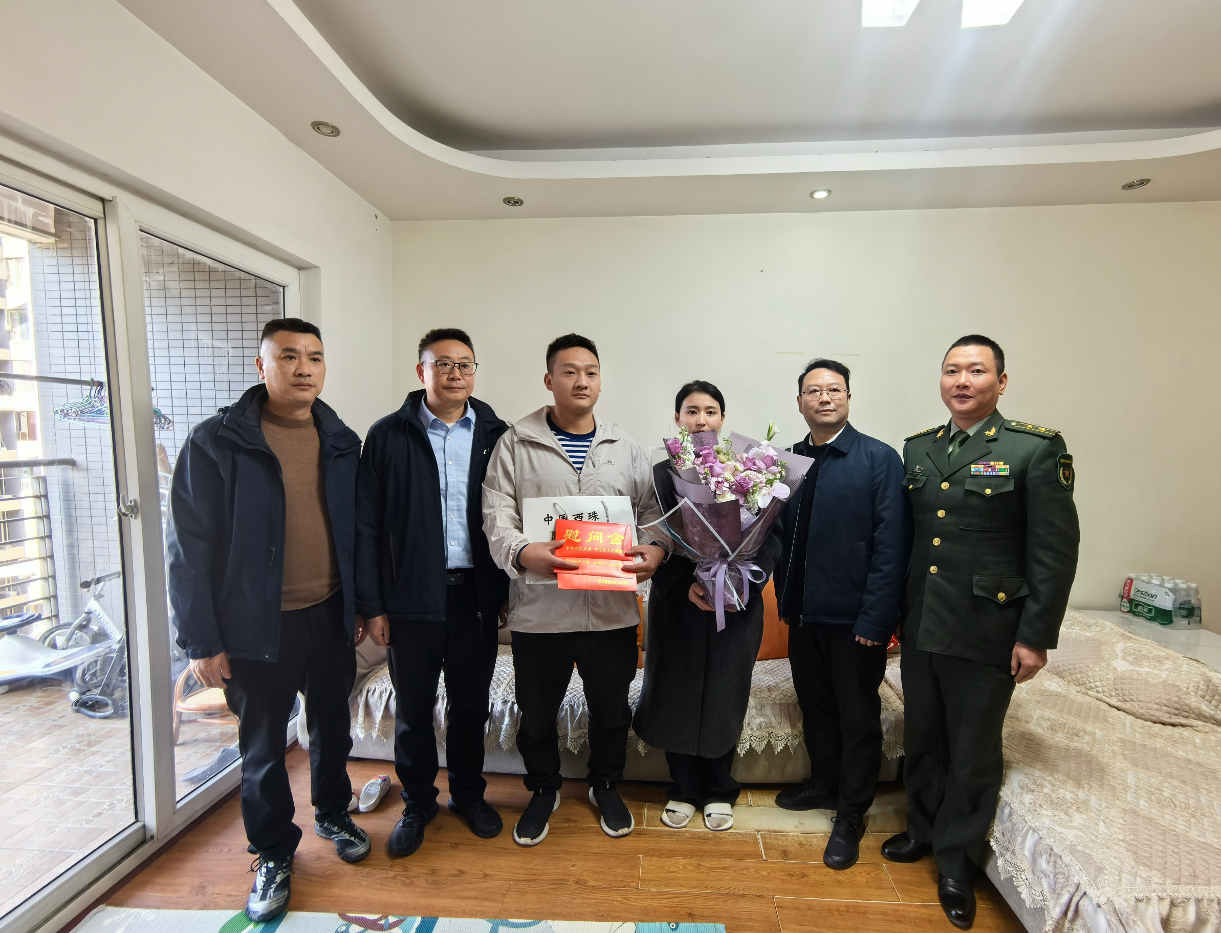 慰问现场,四川省退役军人事务厅相关负责人关切询问了张浩楠的身体状况和生活情况,对他的见义勇为行为给予了充分肯定和高度赞扬,并表达了各级领导的亲切问候和美好祝福,同时送上了省、市、县三级相关部门准备的慰问金。