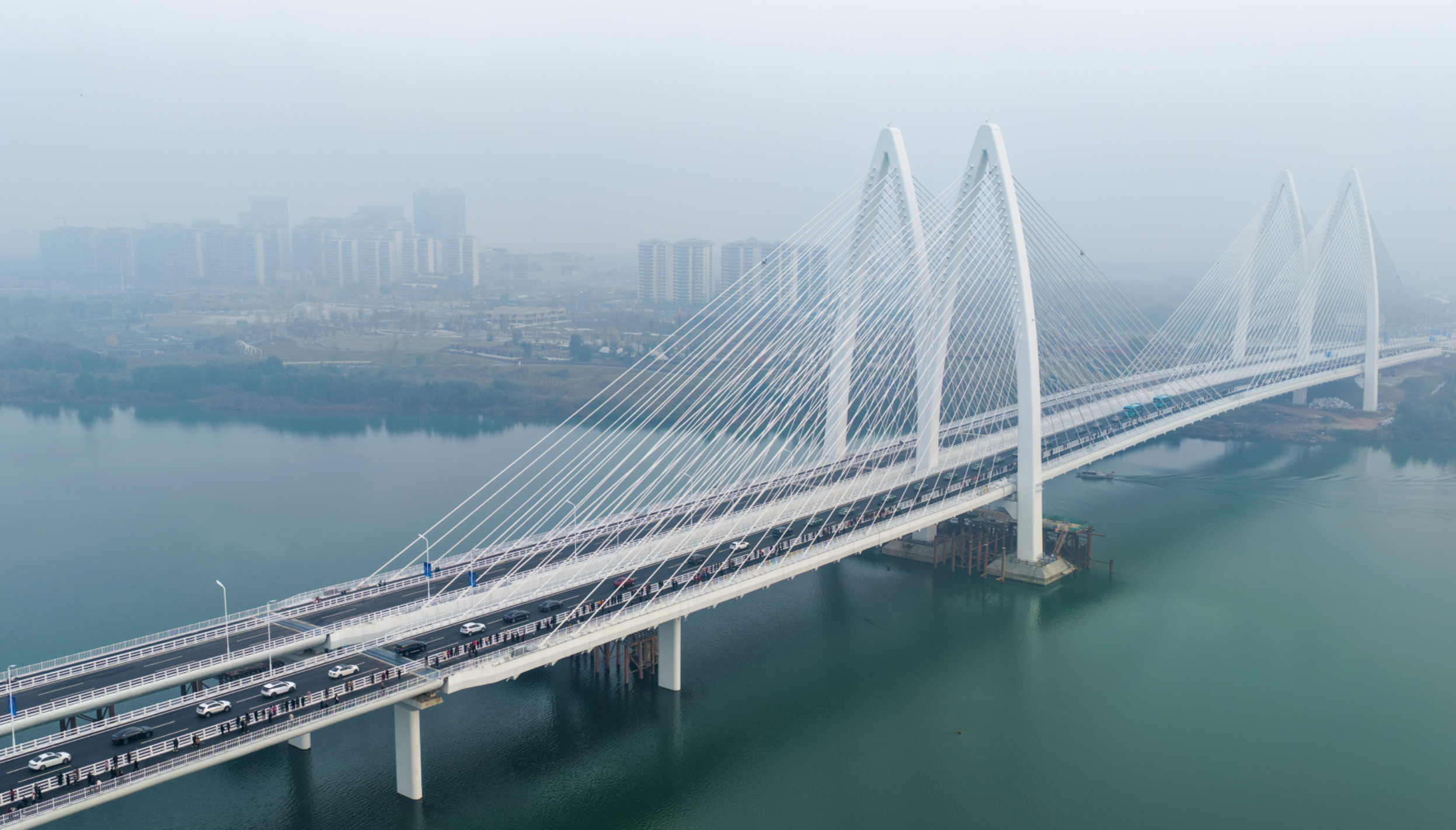 涪江六桥坐落于遂宁城区北部,项目全长3215米,按一级公路标准配套市政设施,采用双向六车道建设,设计时速60公里,同步设置非机动车道、人行道,兼顾通行效率与出行安全。该桥由港珠澳大桥总设计师孟凡超大师主持设计,桥塔造型以遂宁“圣莲荷花”为设计灵感,索塔为全国首创的复杂曲线荷花瓣形钢混组合结构,呈荷花花瓣造型,生动诠释“清香荷韵”的景观文化主题,成为涪江之上一道亮眼的人文风景线。