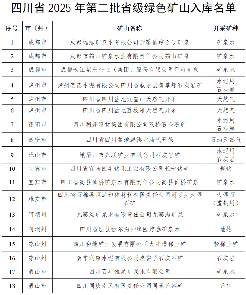 日前,四川省2025年第二批省级绿色矿山入库名单公示,成都远泓矿泉水有限公司云雾仙踪2号矿泉等18家矿山拟纳入省级绿色矿山名录,公示期至2025年12月31日。