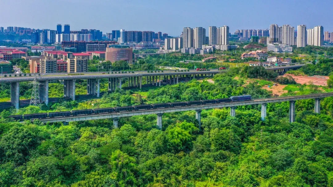2023年6月27日,隆黄铁路既有线上,一列货运火车驶过泸州城区二环路龙马潭区附近。