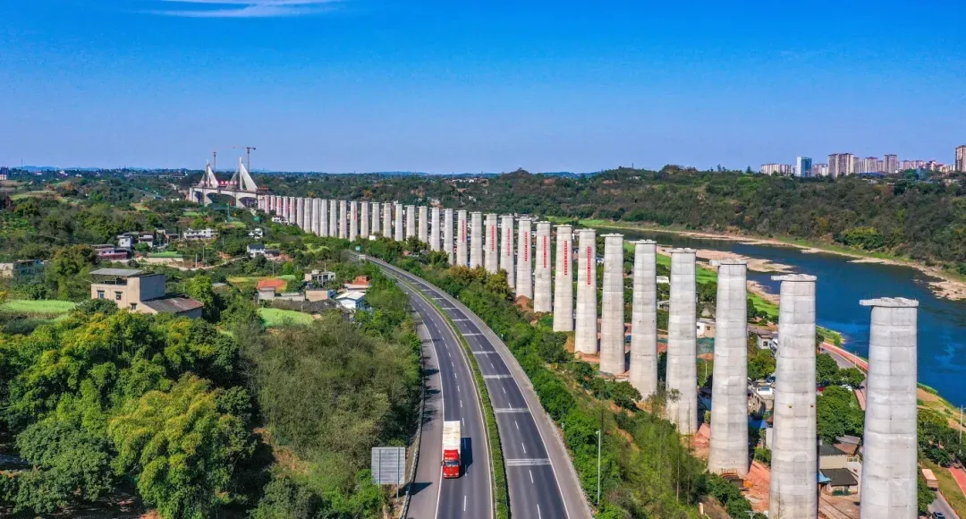 2024年3月25日,西部陆海新通道隆泸叙铁路施工现场,桥墩林立,与G76厦蓉高速公路在沱江畔“并行”。