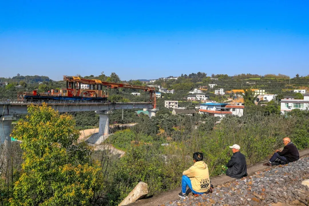 2025年3月25日,在泸县玉蟾街道白龙塔村境内,西部陆海新通道隆泸叙铁路正在吊装架梁,全线836孔梁已完成过半,吸引当地居民关注。