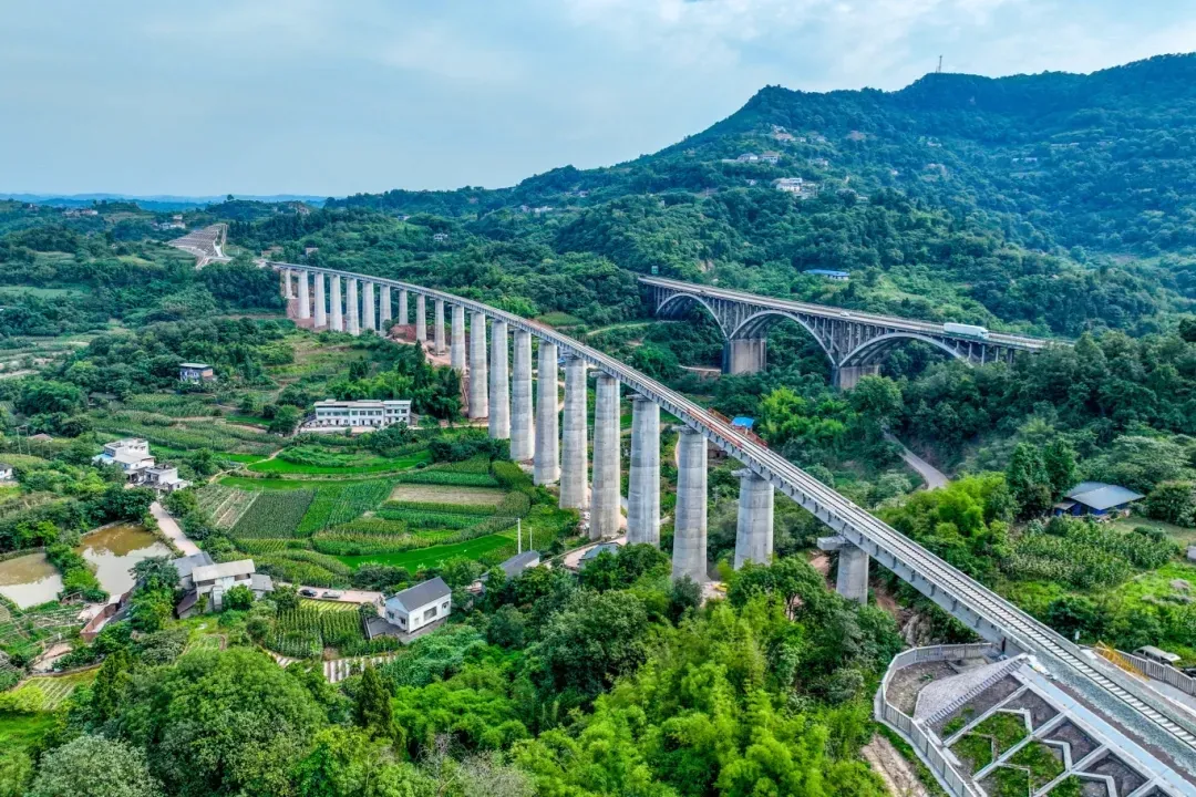 2025年6月10日,在泸州市江阳区方山镇云峰村附近,西部陆海新通道隆泸叙铁路与G76厦蓉高速公路形成同框景观。