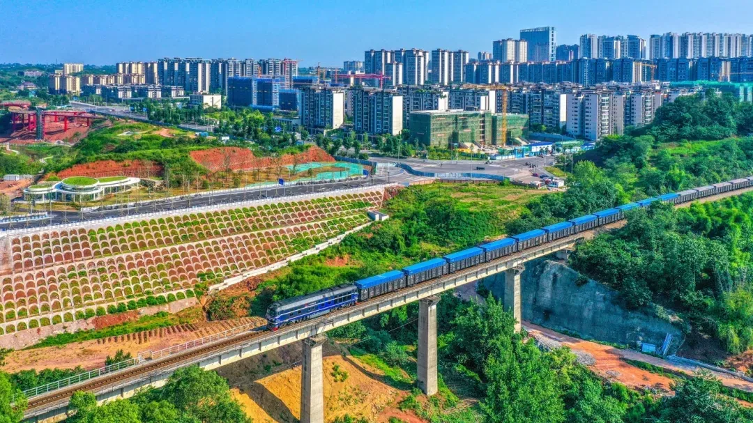 2025年7月14日,在泸州江阳区城西新区,一列货运列车正穿行于隆黄铁路既有线上。钢铁巨龙与拔地而起的现代化新城交相辉映,传统工业动脉与新兴城市景观在此刻完美融合,勾勒出一幅动静相宜的发展画卷。