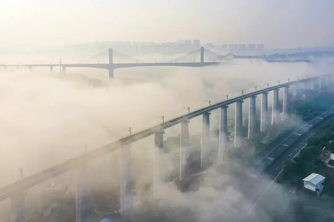 2025年11月26日,初冬时节,西部陆海新通道隆泸叙铁路泸州金山沱江铁路大桥与渝昆高铁沱江特大桥,在初冬云雾中若隐若现,共同构成一幅壮美的画卷。