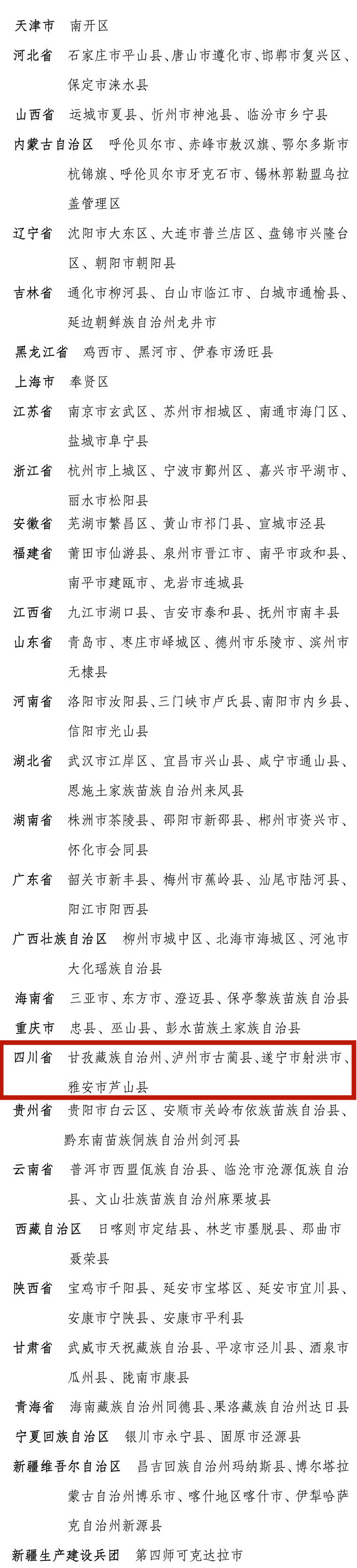其中,四川省甘孜藏族自治州、泸州市古蔺县、遂宁市射洪市、雅安市芦山县这4个地区被命名为2025年生态文明建设示范区;四川省绵阳市平武县、广元市剑阁县、南充市阆中市、川渝雪巴画廊生态屏障统筹发展先行区(达州市宣汉县、重庆市开州区联合申报)这4个地区被命名为2025年“绿水青山就是金山银山”实践创新基地。