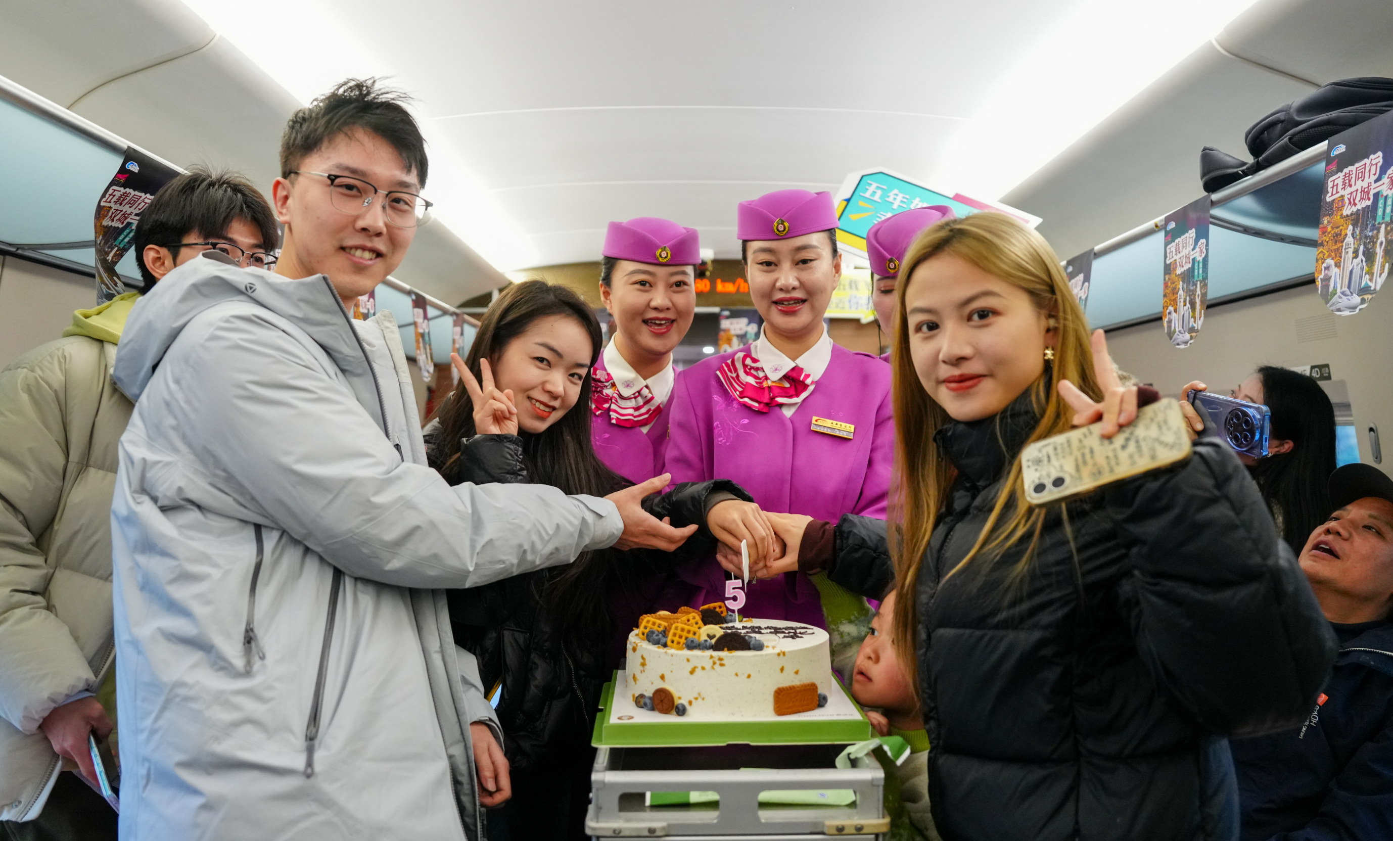四川发布客户端消息 “成渝高铁公交化运营五周年快乐!”12月24日,成都东开往重庆西的G5753次列车车厢内响起阵阵欢歌,一块印有“成渝高铁公交化5周年”字样的主题蛋糕被缓缓推到旅客面前。
