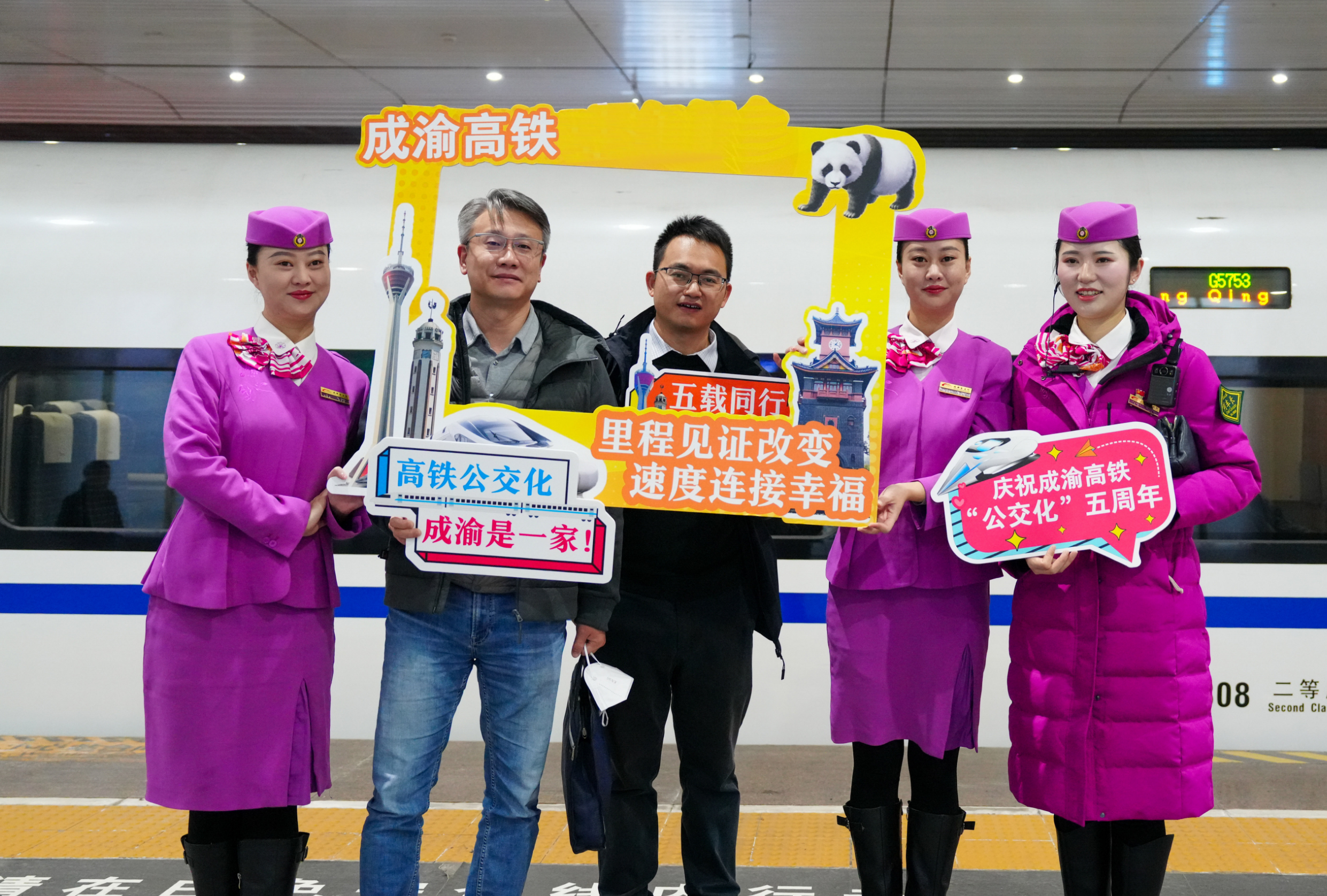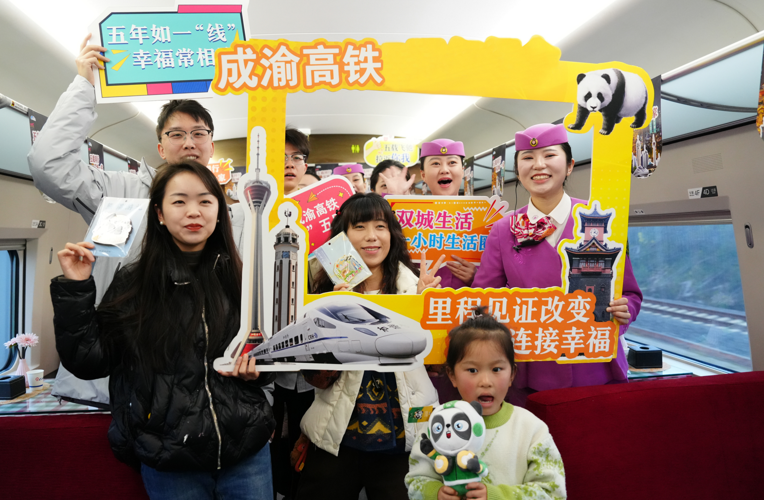活动尾声,全体旅客与工作人员手持纪念卡合影留念,快门声定格下一张张灿烂的笑脸。列车一路向前,朝着重庆西站飞驰而去,窗外的风景不断变换,正如成渝双城五年来日新月异的发展。