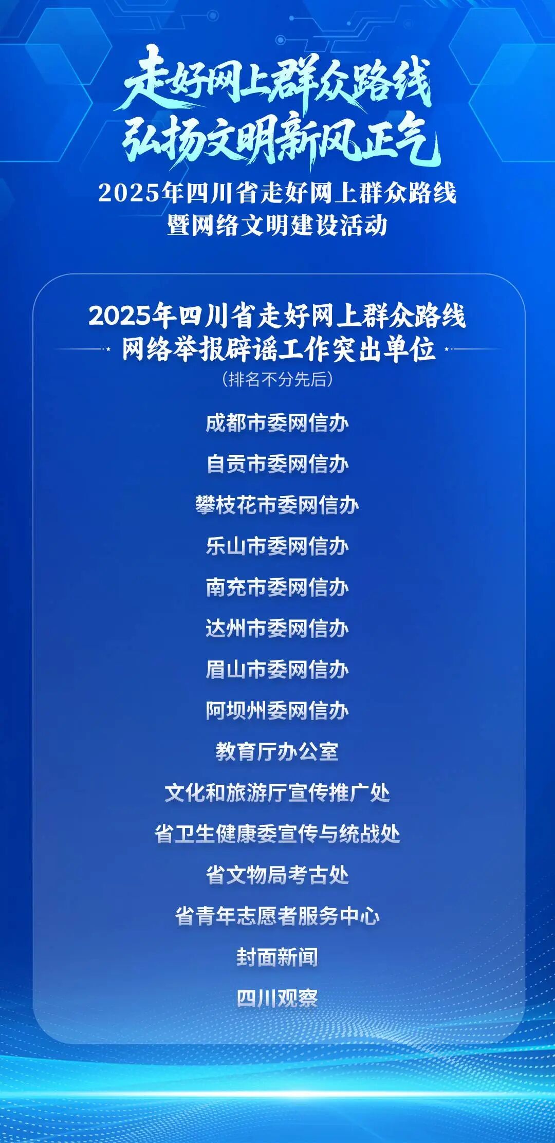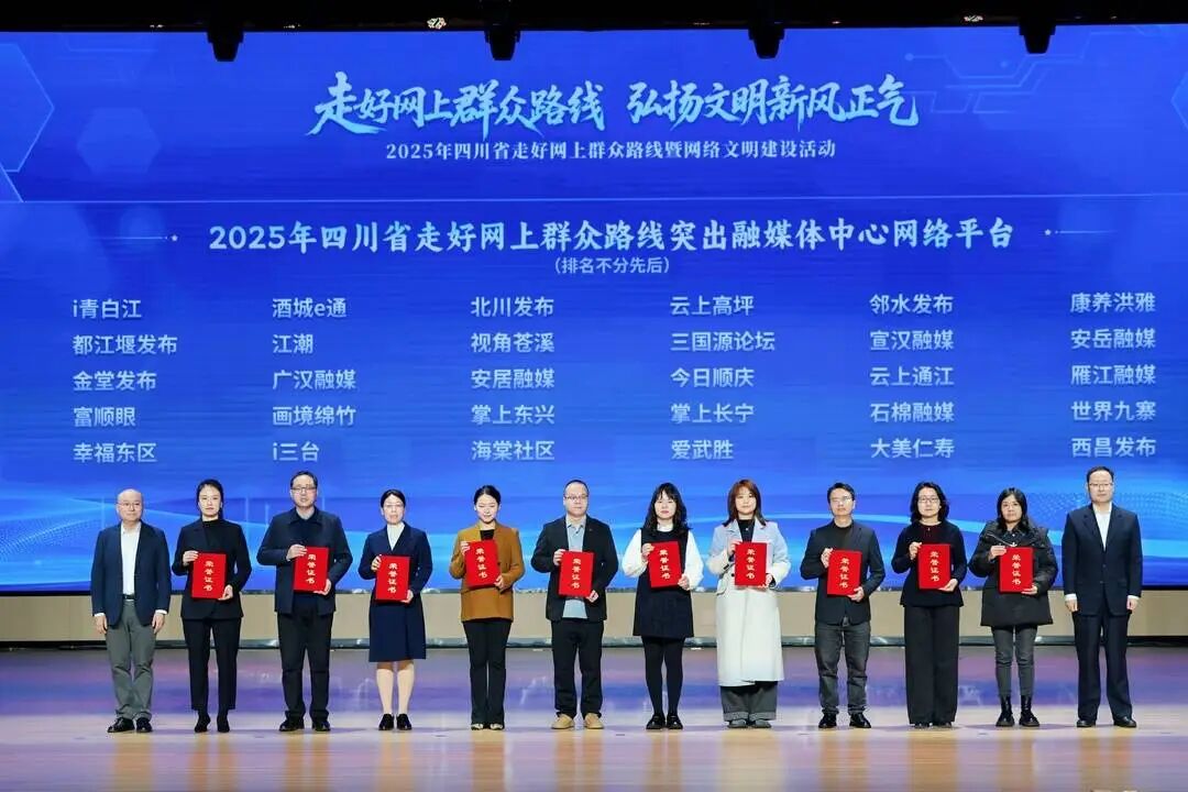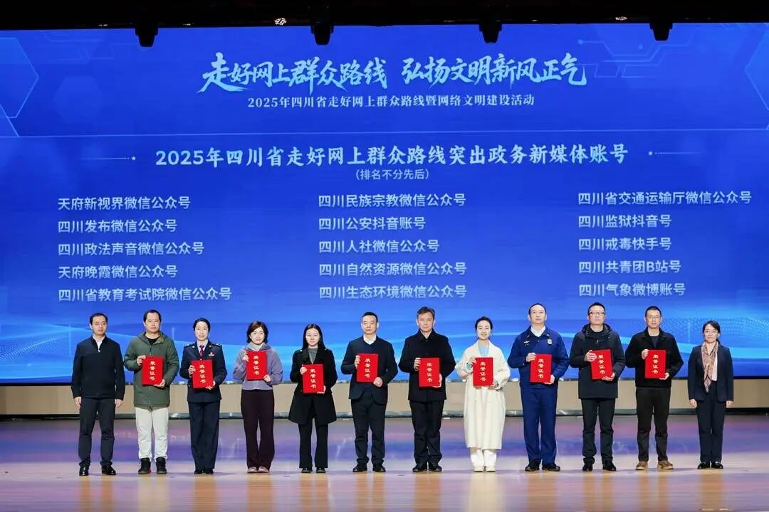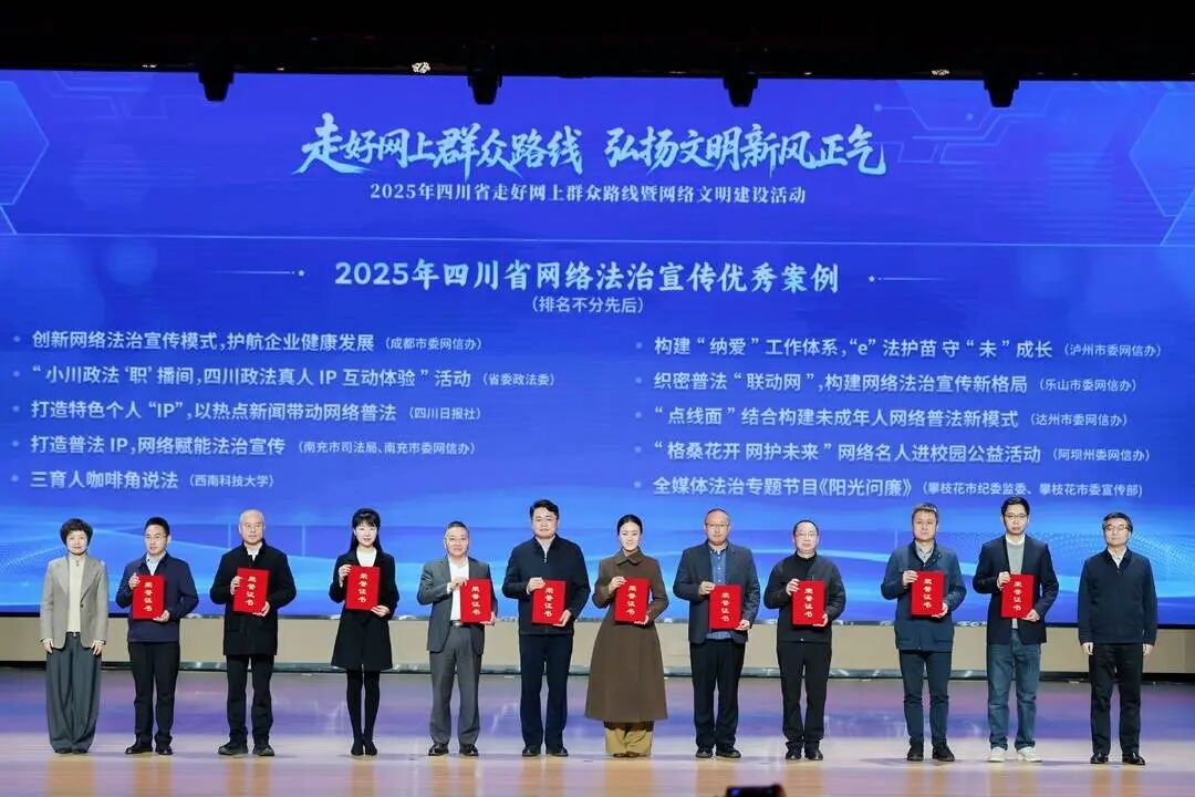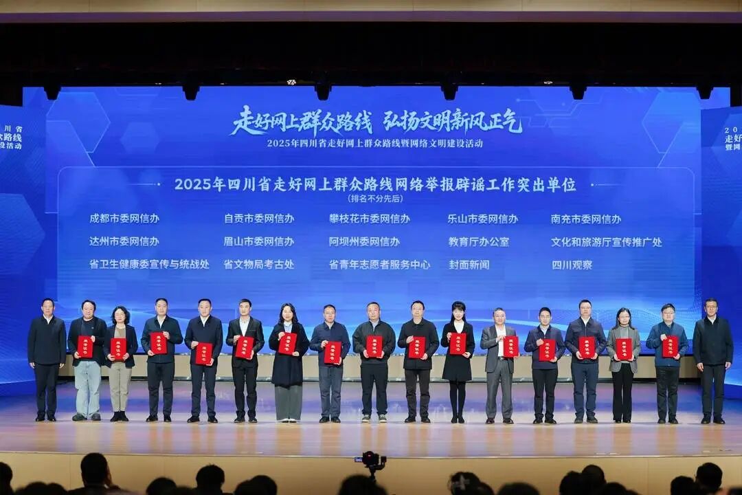现场还为2025年走好网上群众路线突出政务新媒体账号、走好网上群众路线突出案例、走好网上群众路线突出融媒体中心网络平台、四川省网络法治宣传优秀案例、网络举报辟谣工作突出单位进行了颁奖,以典型引领激发各地各部门工作活力。